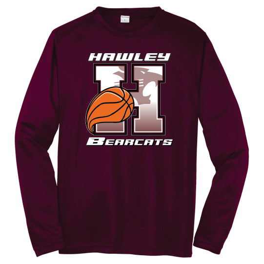 This is a Pre-Order! The DEADLINE to order is on Sunday, November 23rd. Show your support for the Hawley Bearcat Basketball team with some merchandise. Hawley Basketball design on the front of a Maroon Tee. 6 different shirt options to choose from Short Sleeve or Long Sleeve - Cotton or Wicking, Crewneck Sweatshirt or Hoodie.