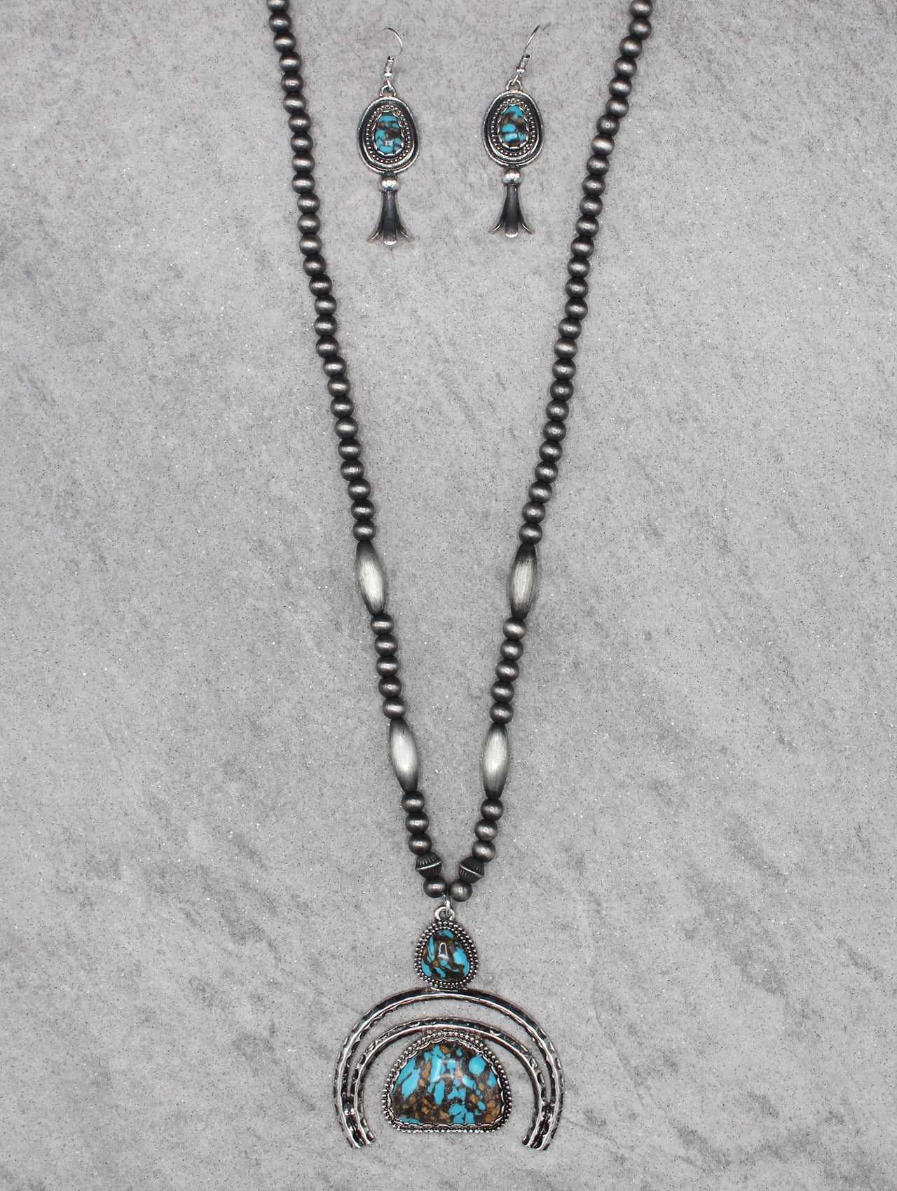 This set has a 27" necklace with an amazing turquoise stone that just speaks western. The necklace also is paired with the same turquoise stone earrings. These two together are the perfect for everyday wear with their lightweight feel.