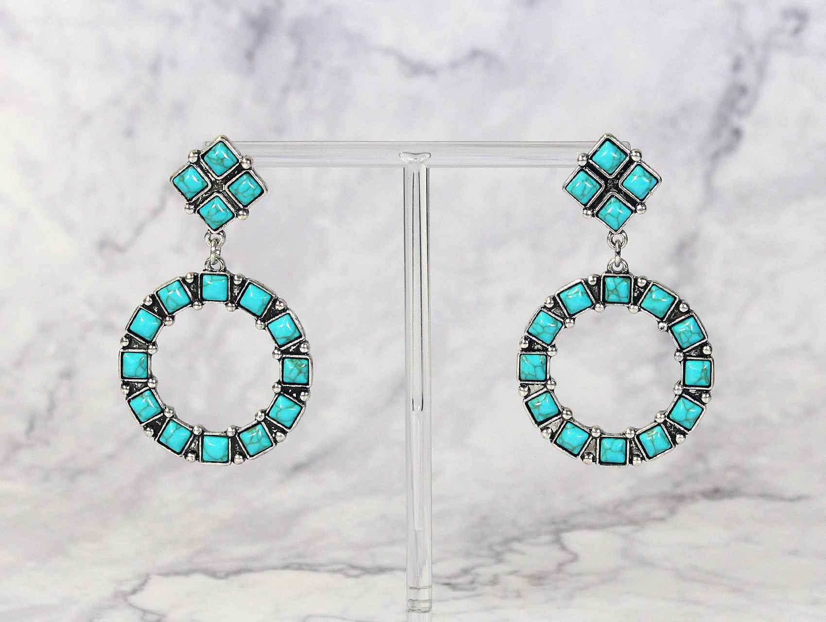 1598 (1) Western Square Circle Drop Earrings with Turquoise