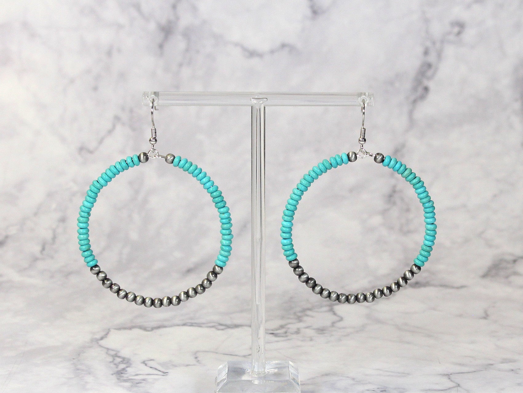 These large hoop earrings feature a structured wire base wrapped with a combination of turquoise-colored beads and silver-tone metallic spacers.