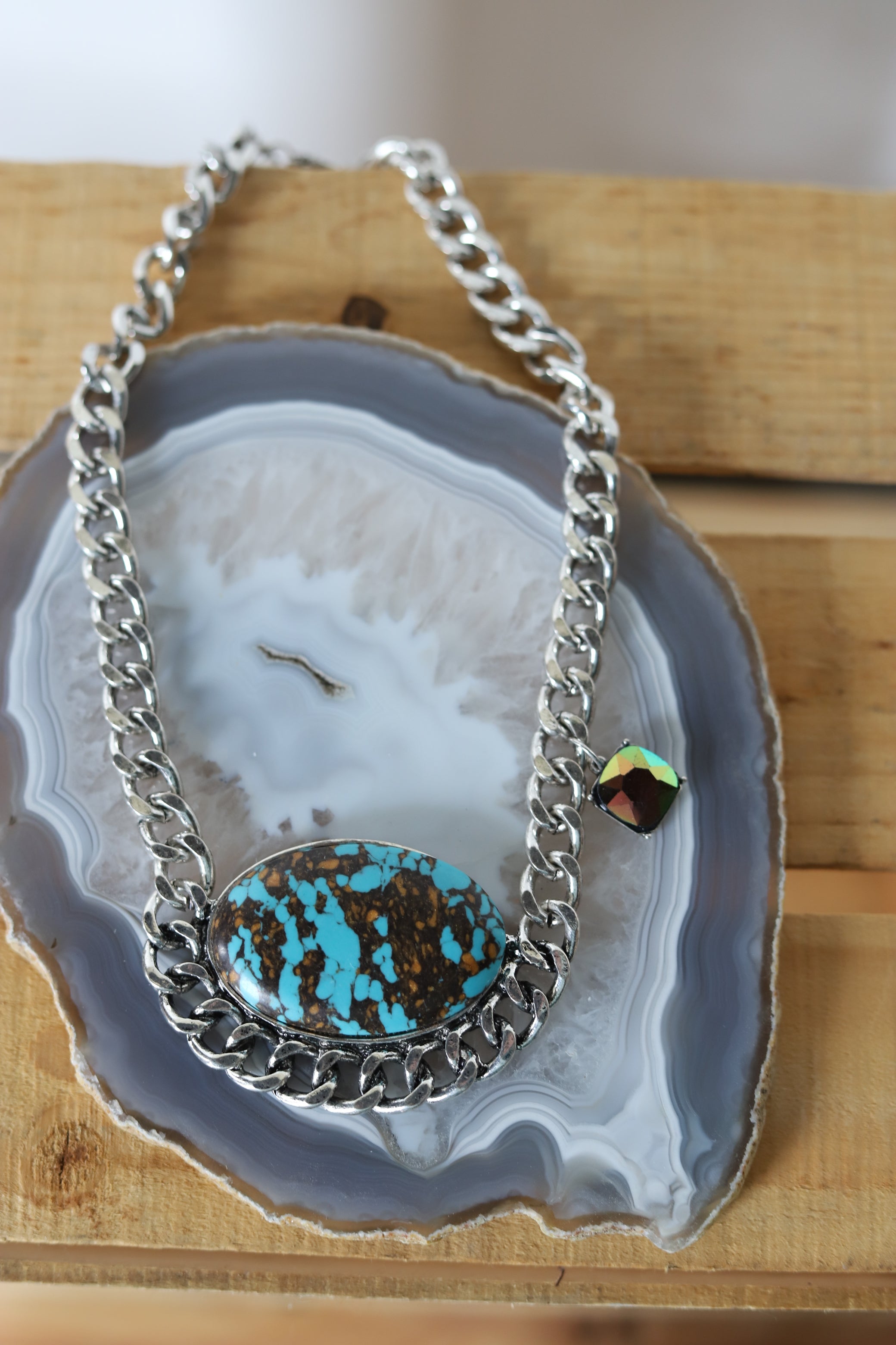 This necklace features a bold and eye-catching design with a silver-tone curb chain and an oversized turquoise centerpiece. The chain is constructed of large, flat interlocking links, giving the piece a modern and statement look. The turquoise stone, set in a silver-tone bezel, is oval-shaped and displays a striking matrix pattern with vibrant blue and earthy brown tones, creating a natural, organic feel.