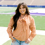Giddy-up it's game day, and this cutesy shirt is all the rage, pair with denim skirt and you will have the ultimate game day look. This blouse is a perfected burnt orange and white gingham pattern with a bow feature that truly elevates this game day look.