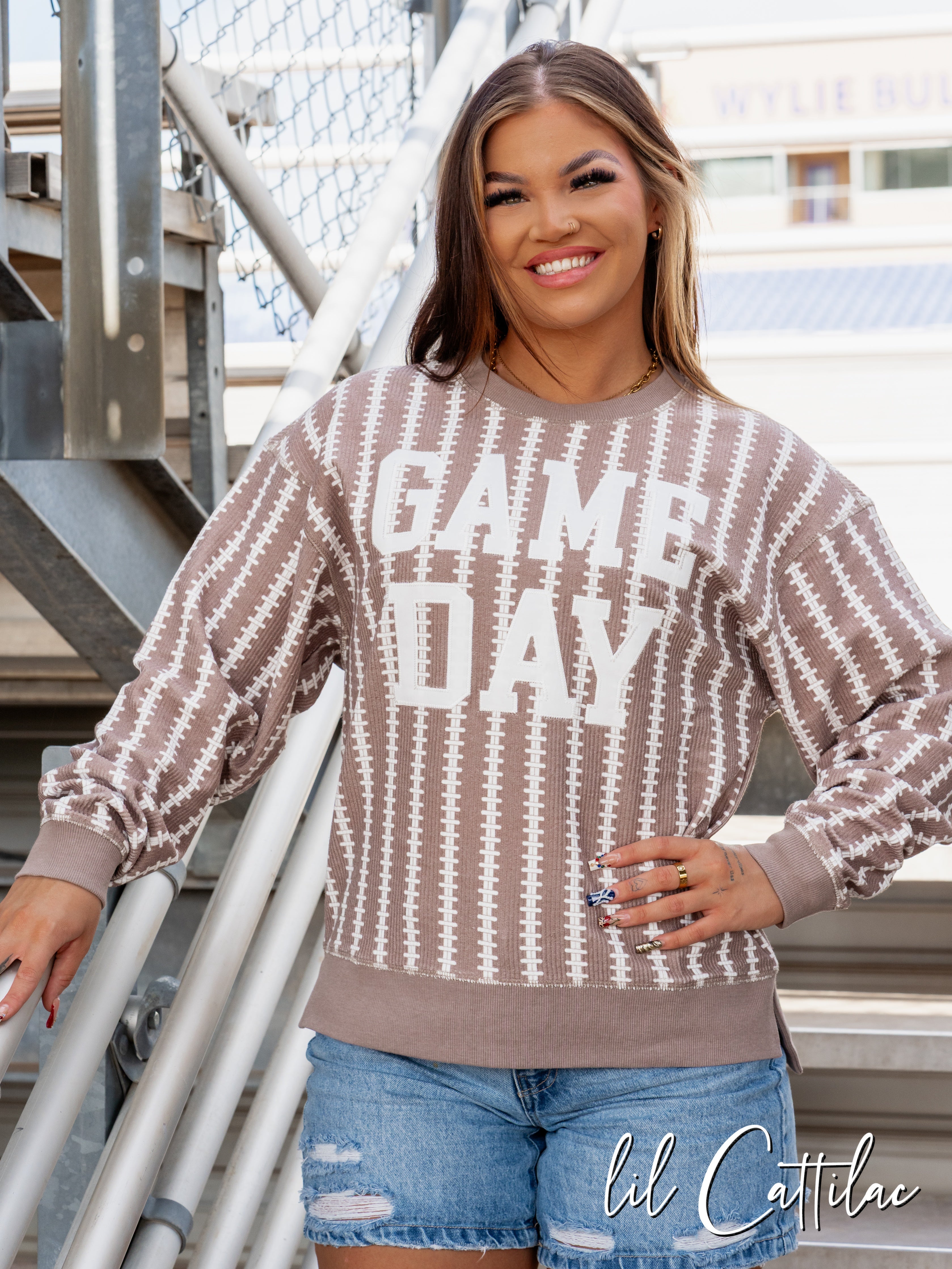 Game Day appliqued on a Football Laces cozycord sweatshirt.