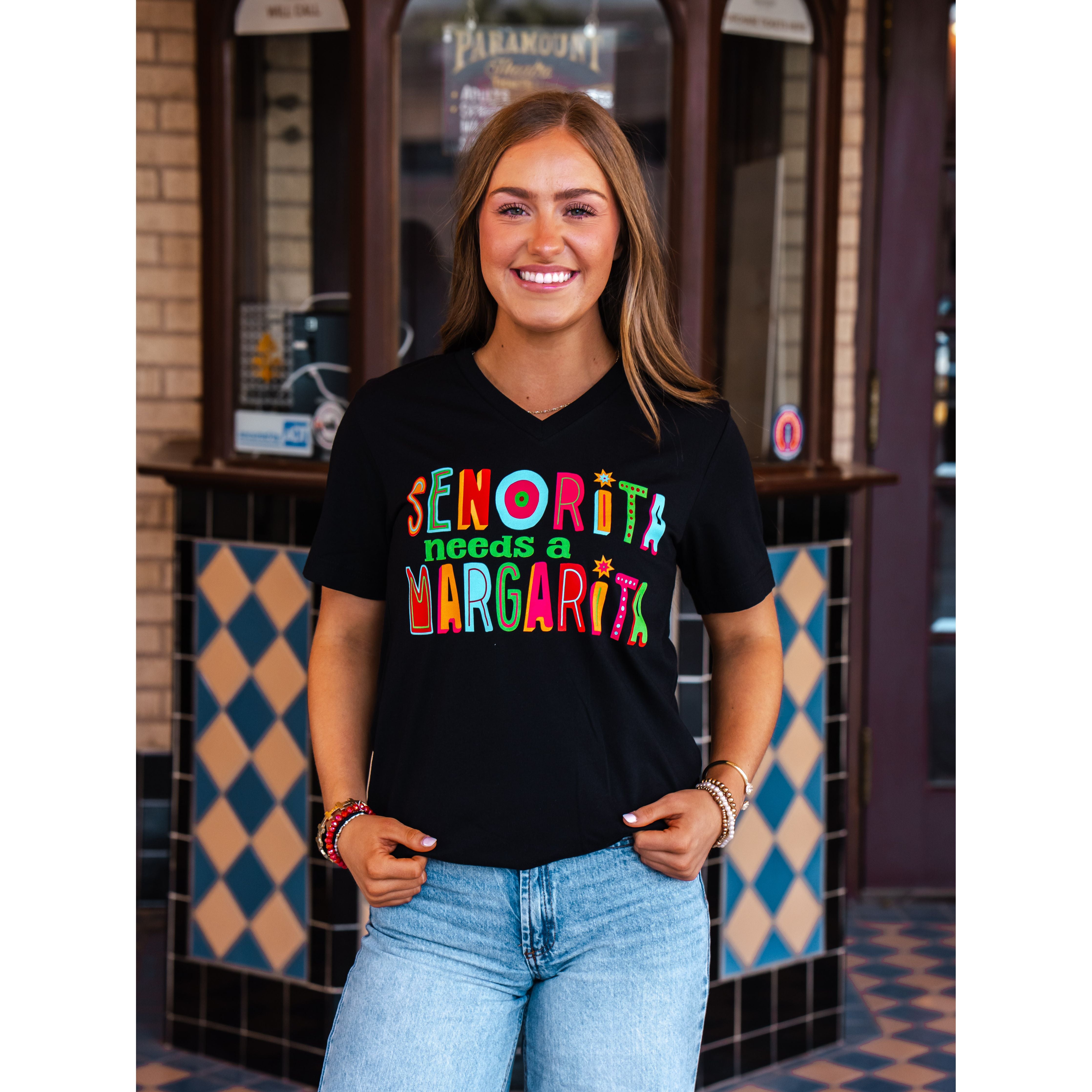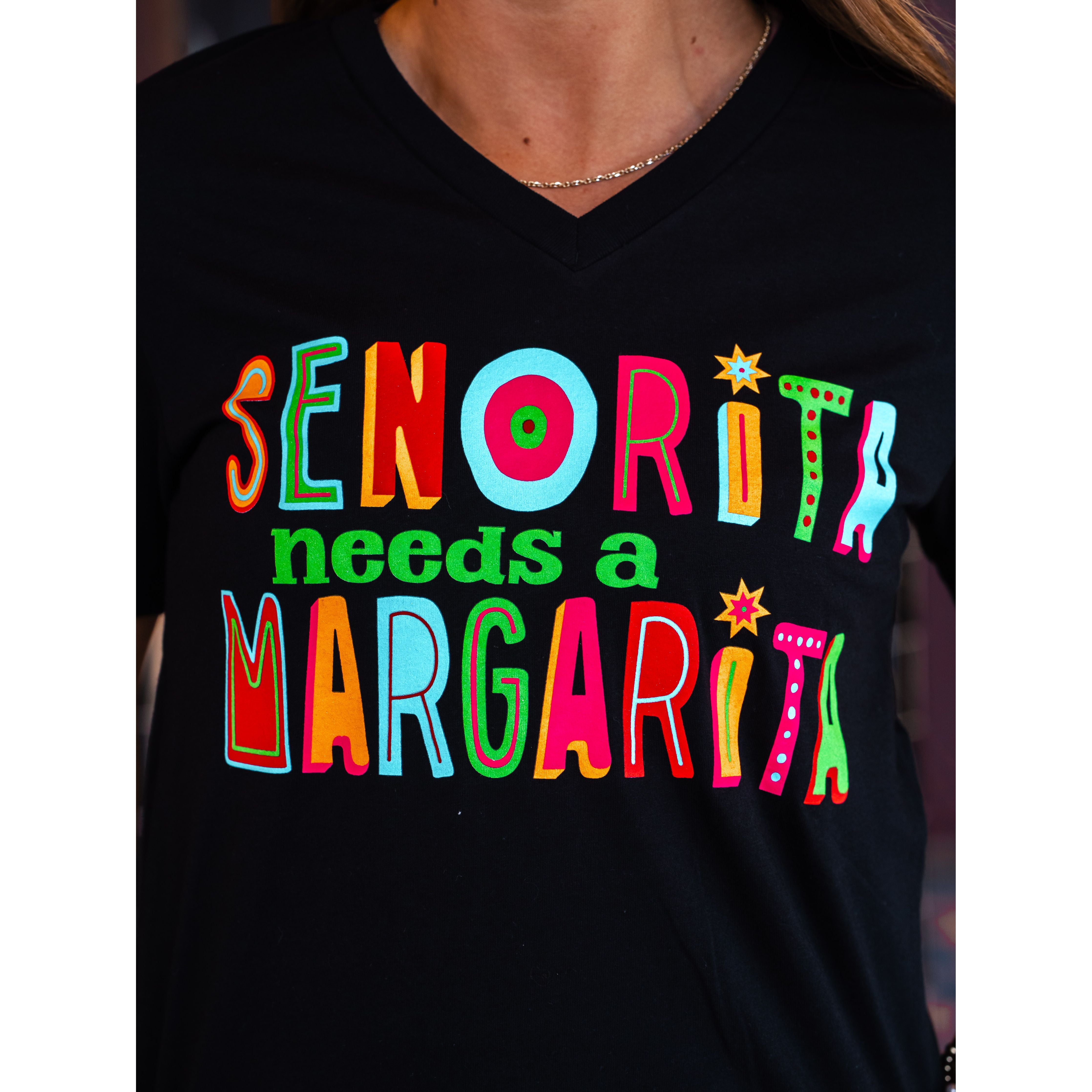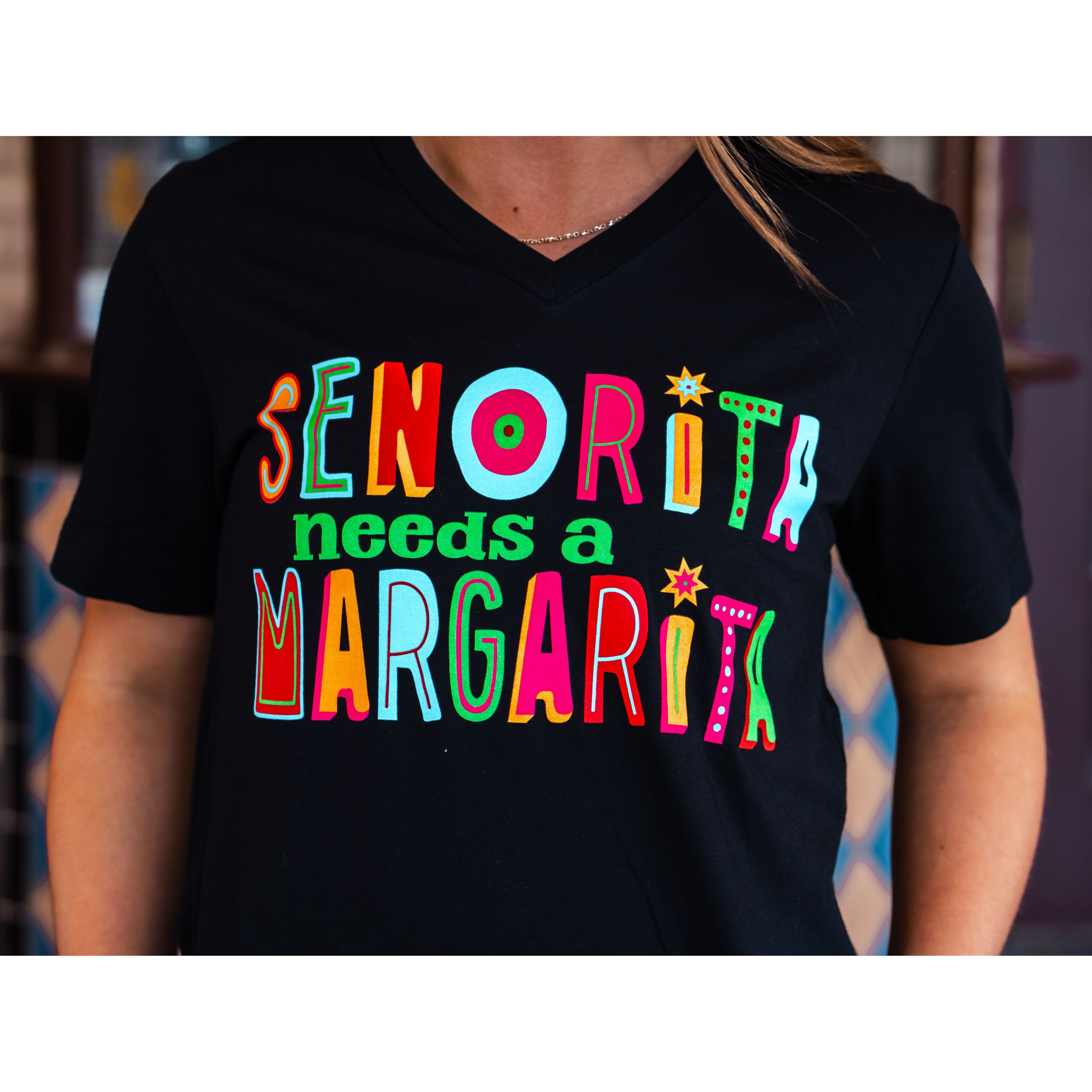 Senorita needs a margarita! Celebrate Cinco de Mayo in style with our fun and vibrant graphic tee. This eye-catching design features bold, colorful lettering that brings the fiesta spirit to your wardrobe.