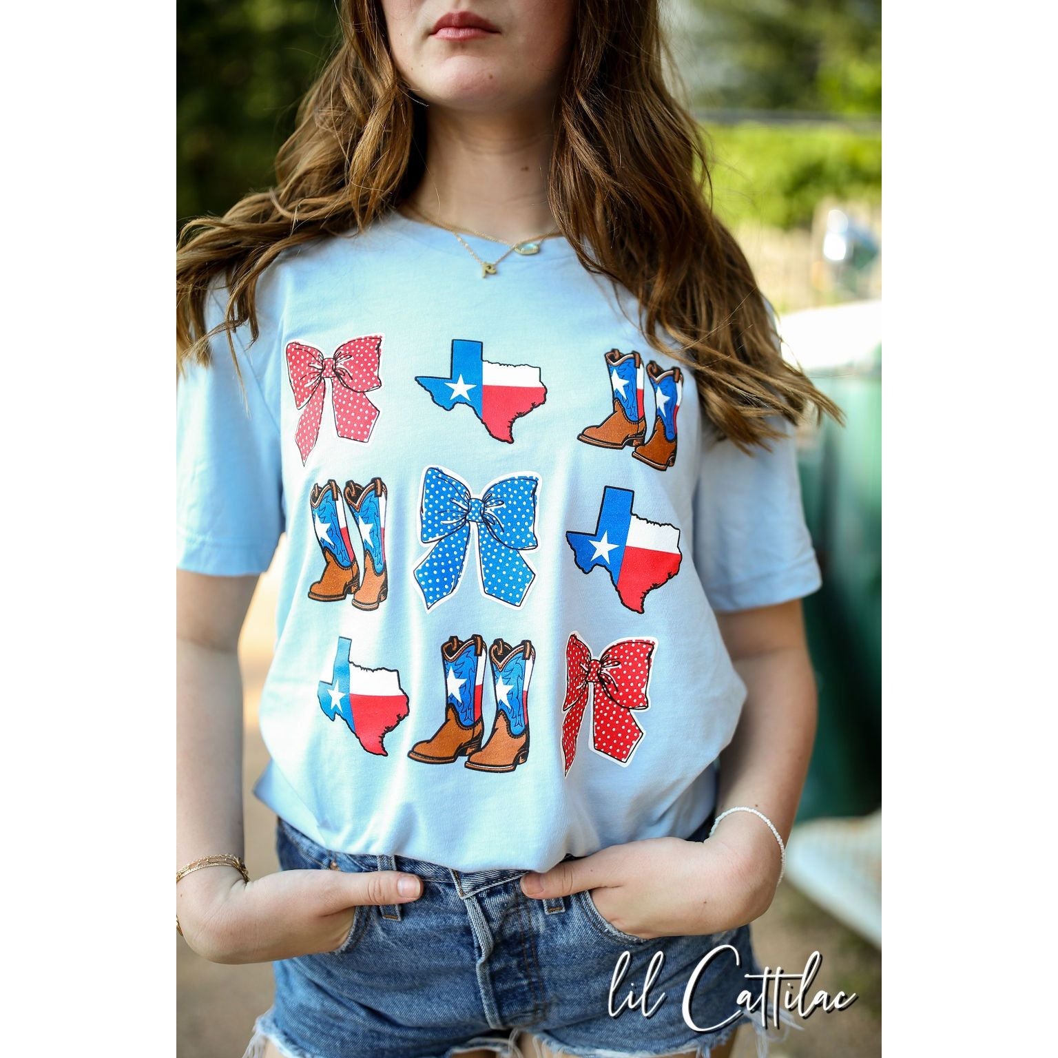 In conclusion, our Texas graphic tee with Bows, Texas Flag and Cowboy Boot are the perfect addition to your wardrobe. It's comfortable, stylish, and versatile, making it a must-have for any Texan or Texas enthusiast. So why not show your love for the Lone Star State and add this tee to your collection today?