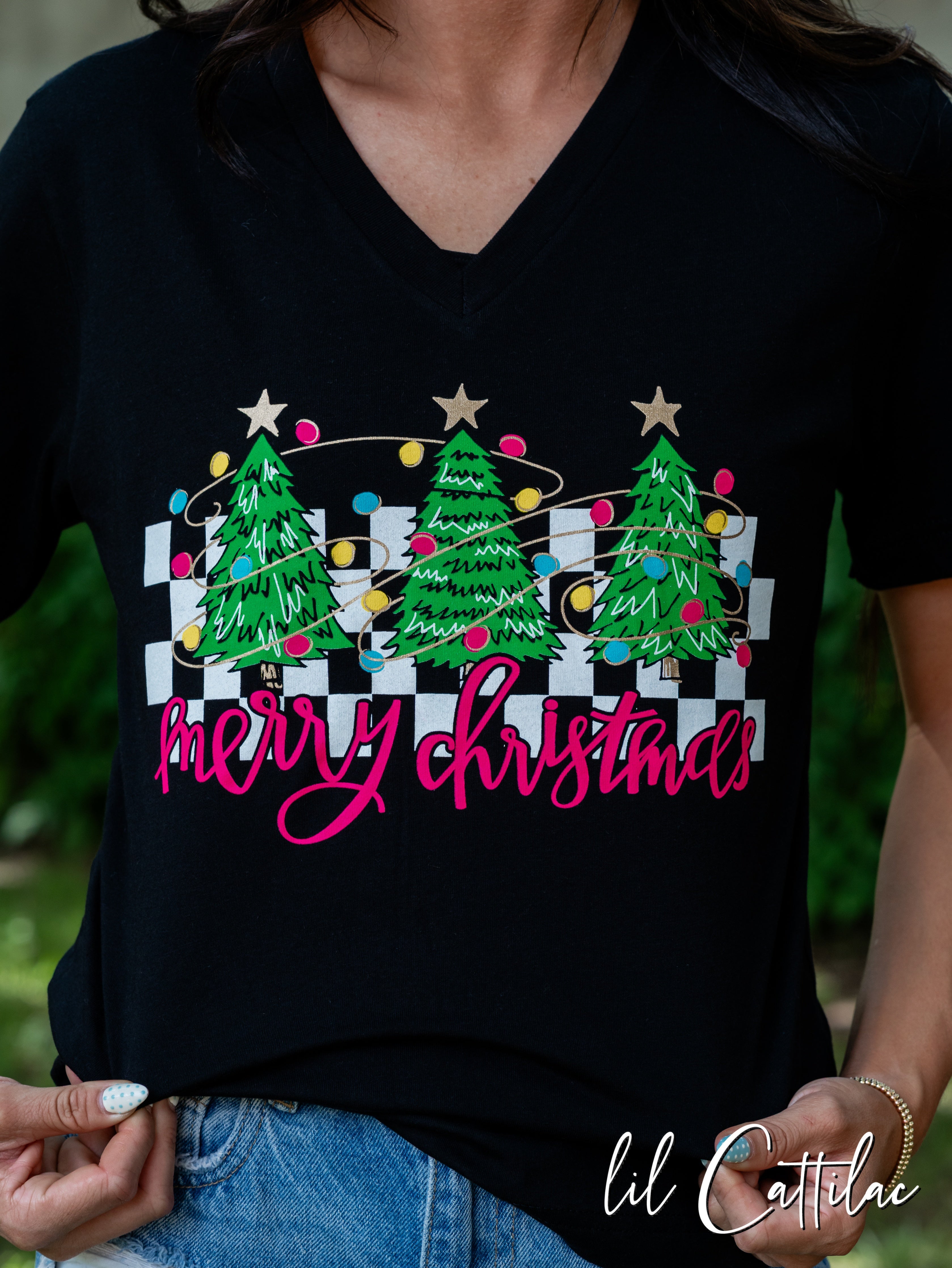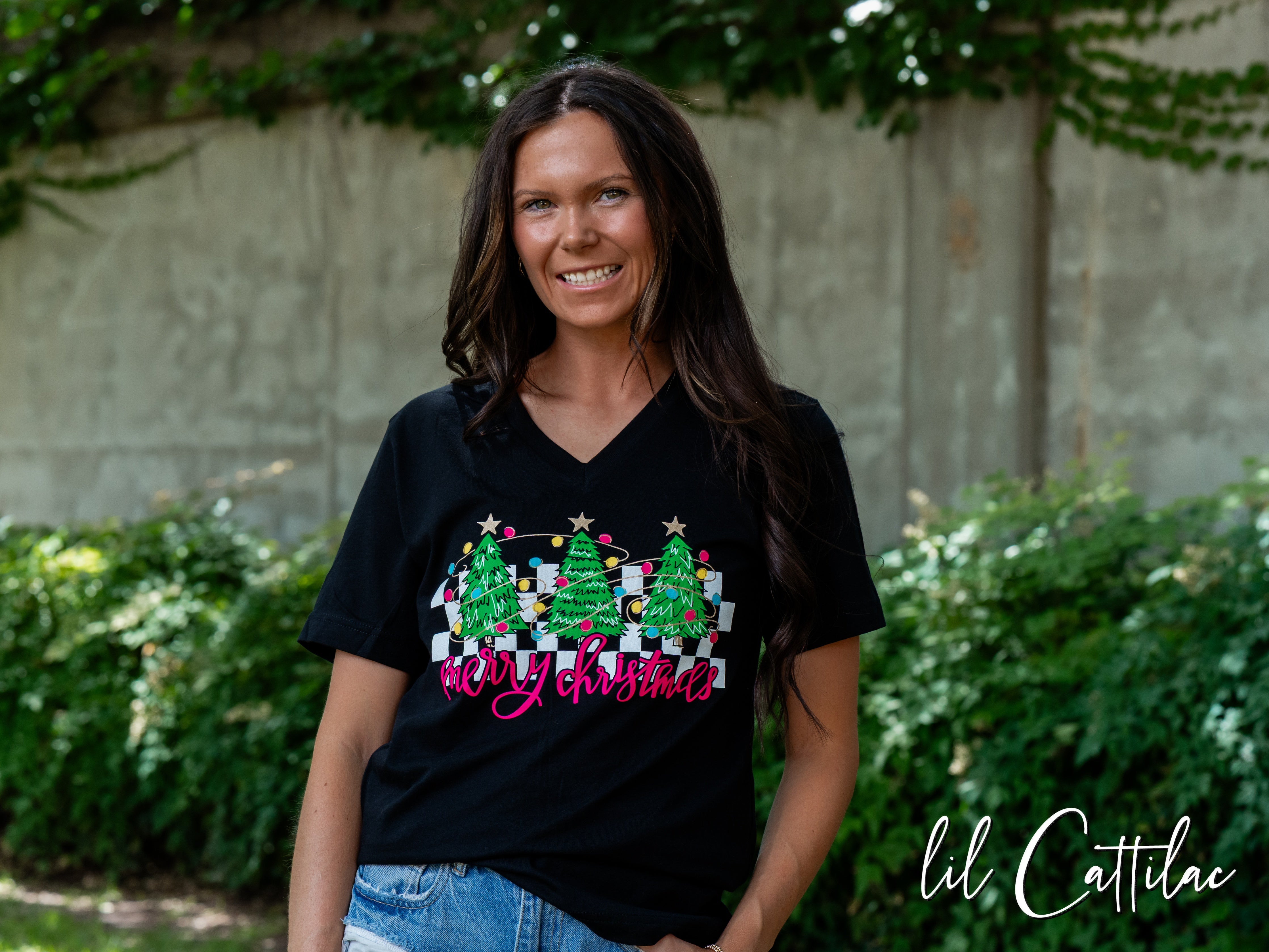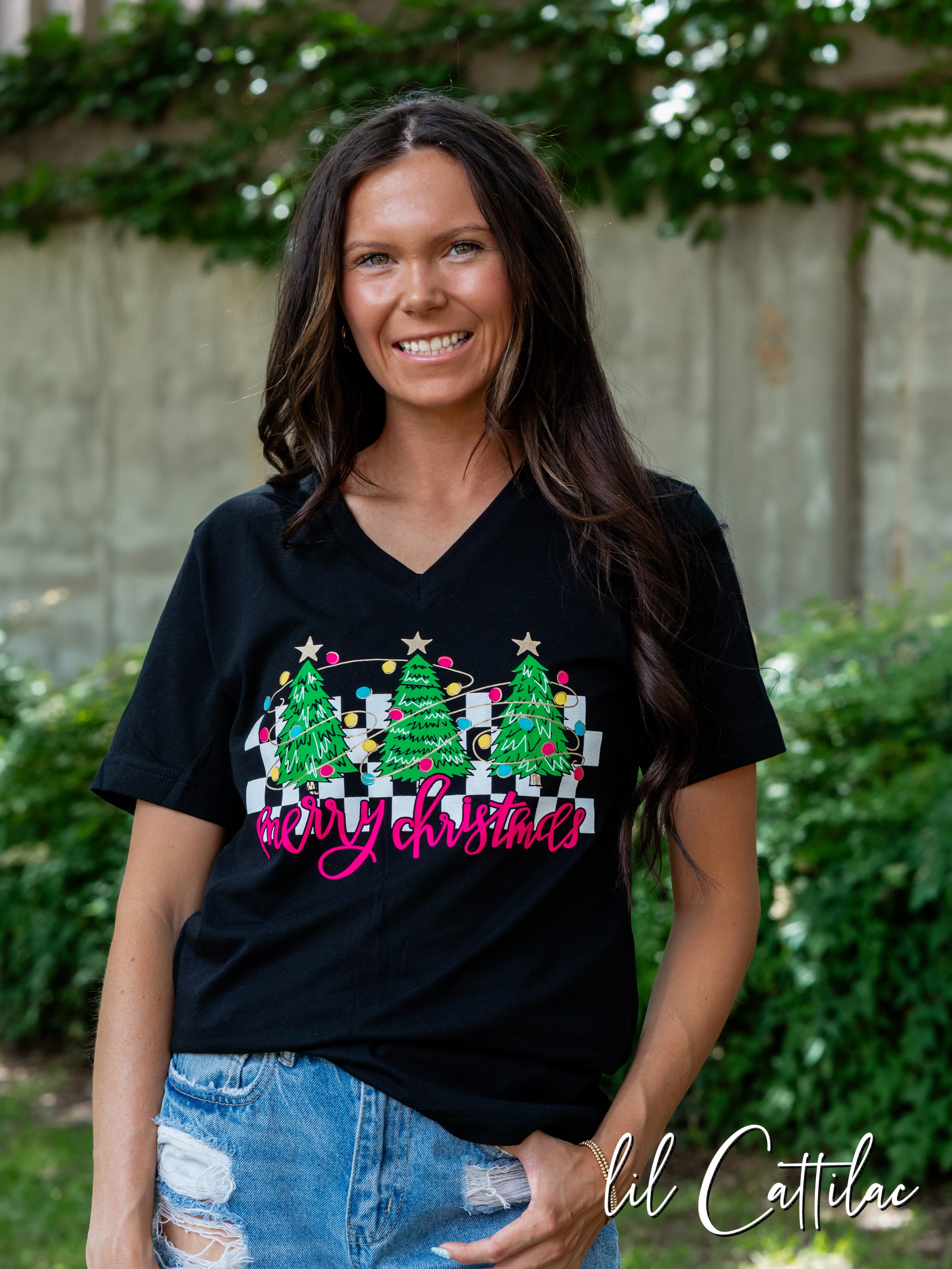 Three festive trees on a checkered backdrop make this a standout seasonal option. It’s cozy, cute, and a top pick for local boutiques.