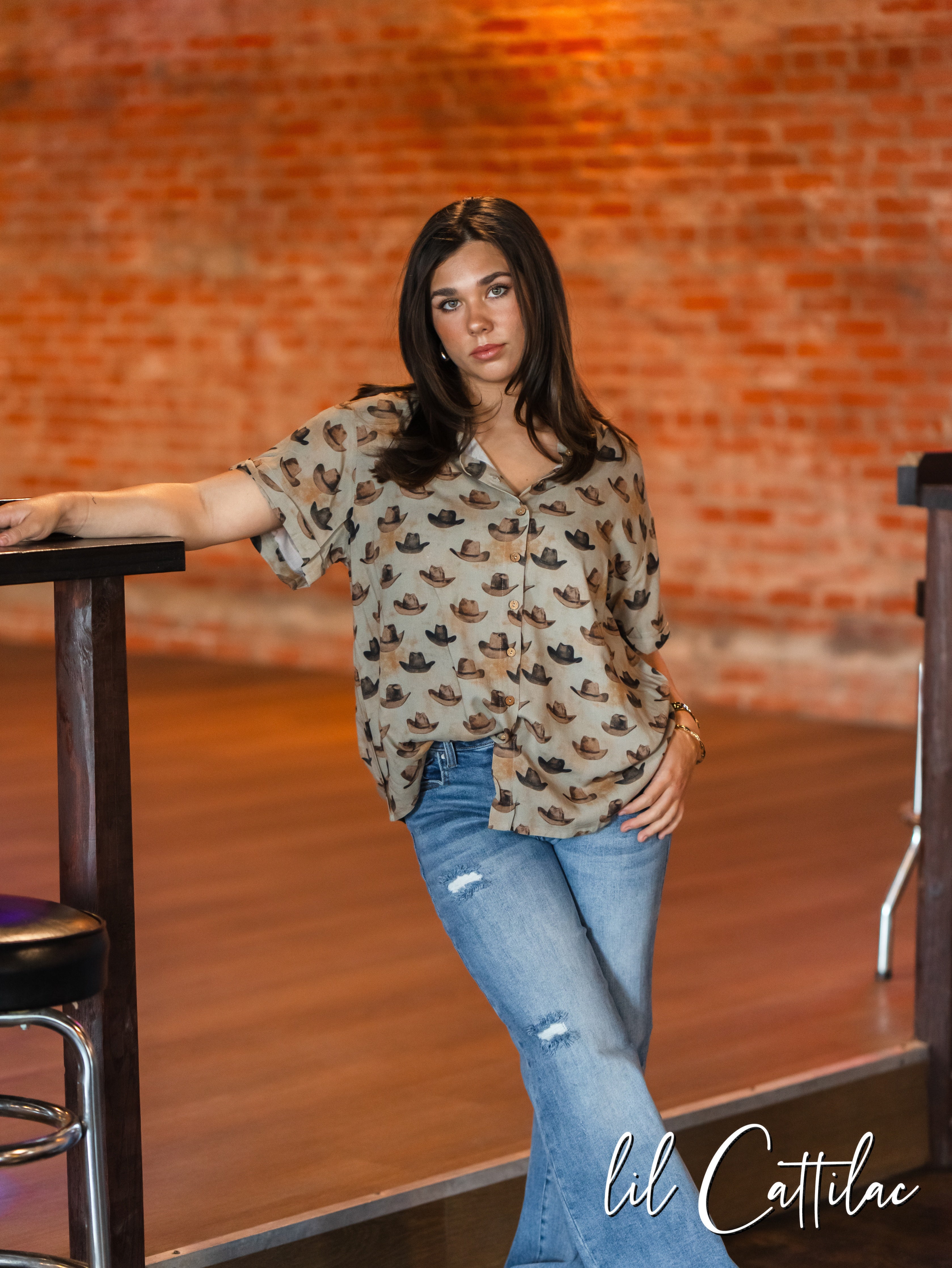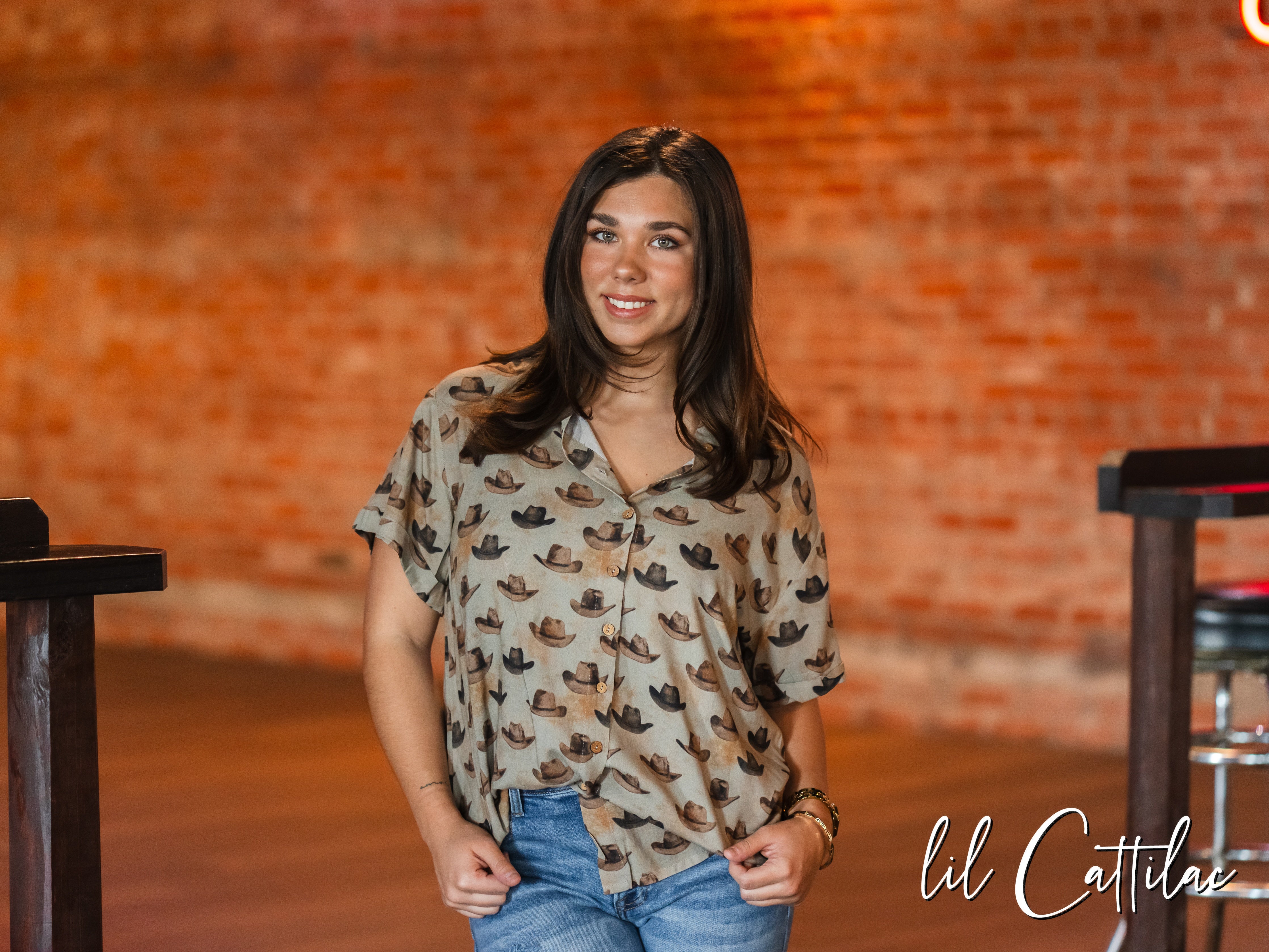Laid back days, bold western spirit. This short sleeve top features a full button front with cowboy hat graphics all across.