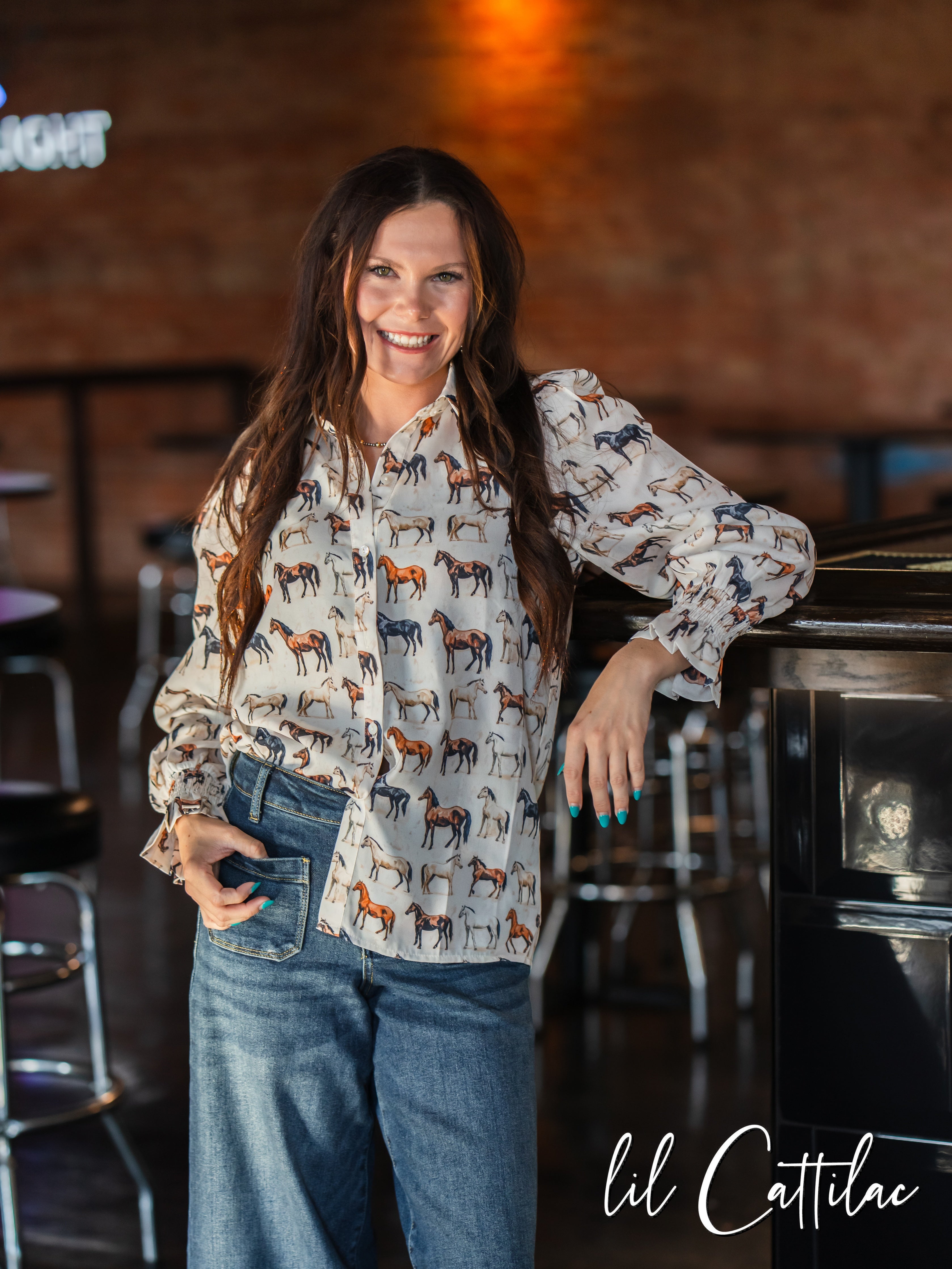 A timeless button-down with character! The Caroline Top features the perfect multi-color horse graphics to add a little western flair to your fit!
