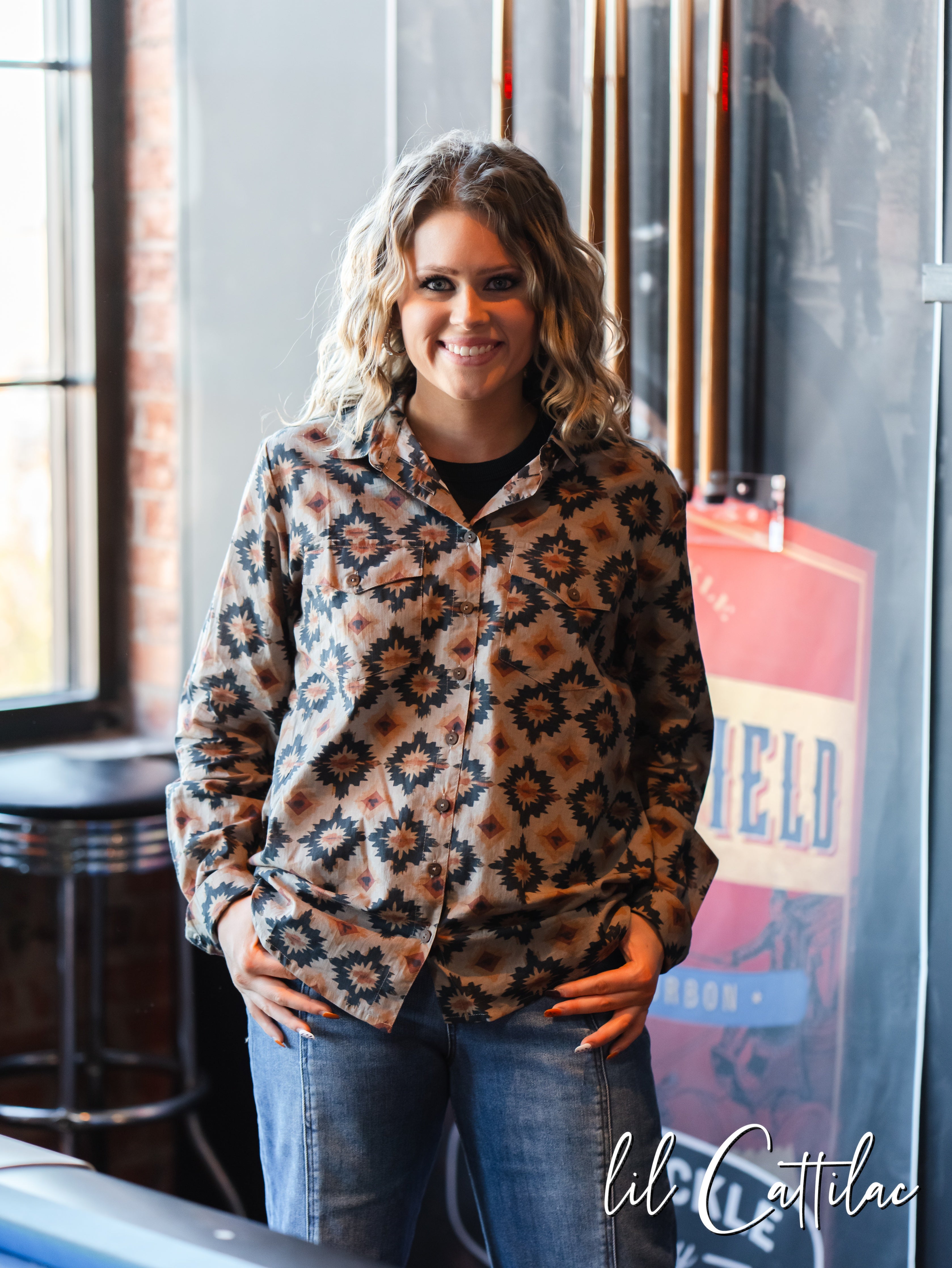 Turn heads with this bold long-sleeve Aztec button-up, perfect for adding warmth and style to your fall lineup. Featuring a structured fit, crisp collar, and all-over vibrant Aztec print, it’s built for both comfort and statement layering.