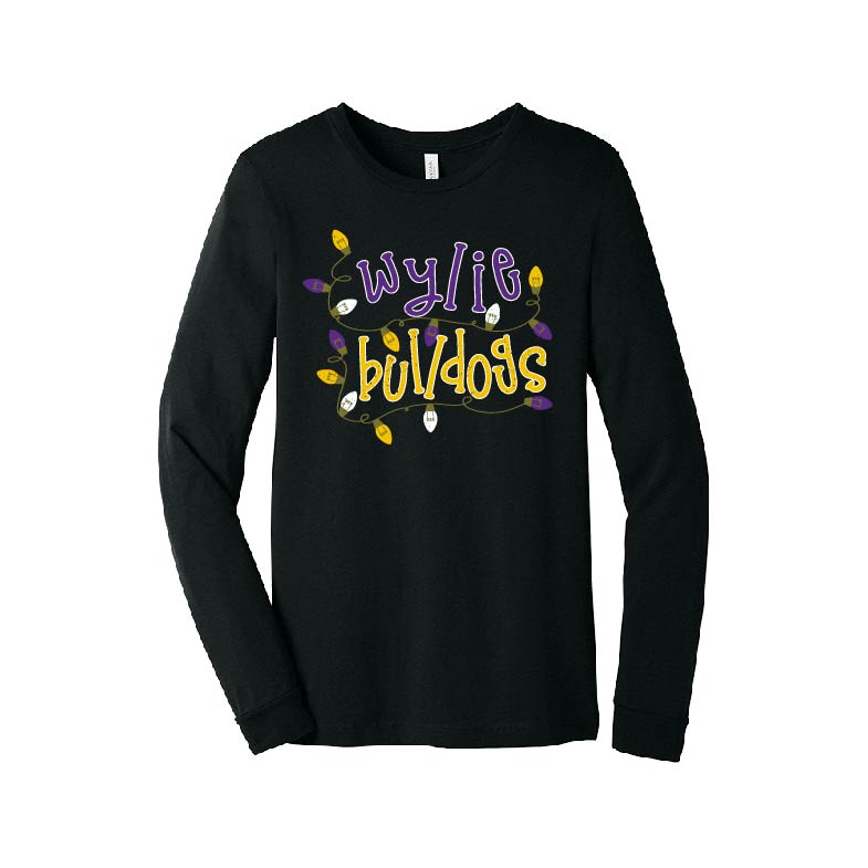 This is a PRE-ORDER...Deadline to order is Sunday, November 23rdShow your spirit with a Wylie Bulldogs sweatshirt in support of the Wylie PTO! 3 different options of shirt styles to choose from a Long-Sleeve Tee, Crewneck or Hooded Sweatshirt.  Wylie Christmas design on the front of a Black sweatshirt.