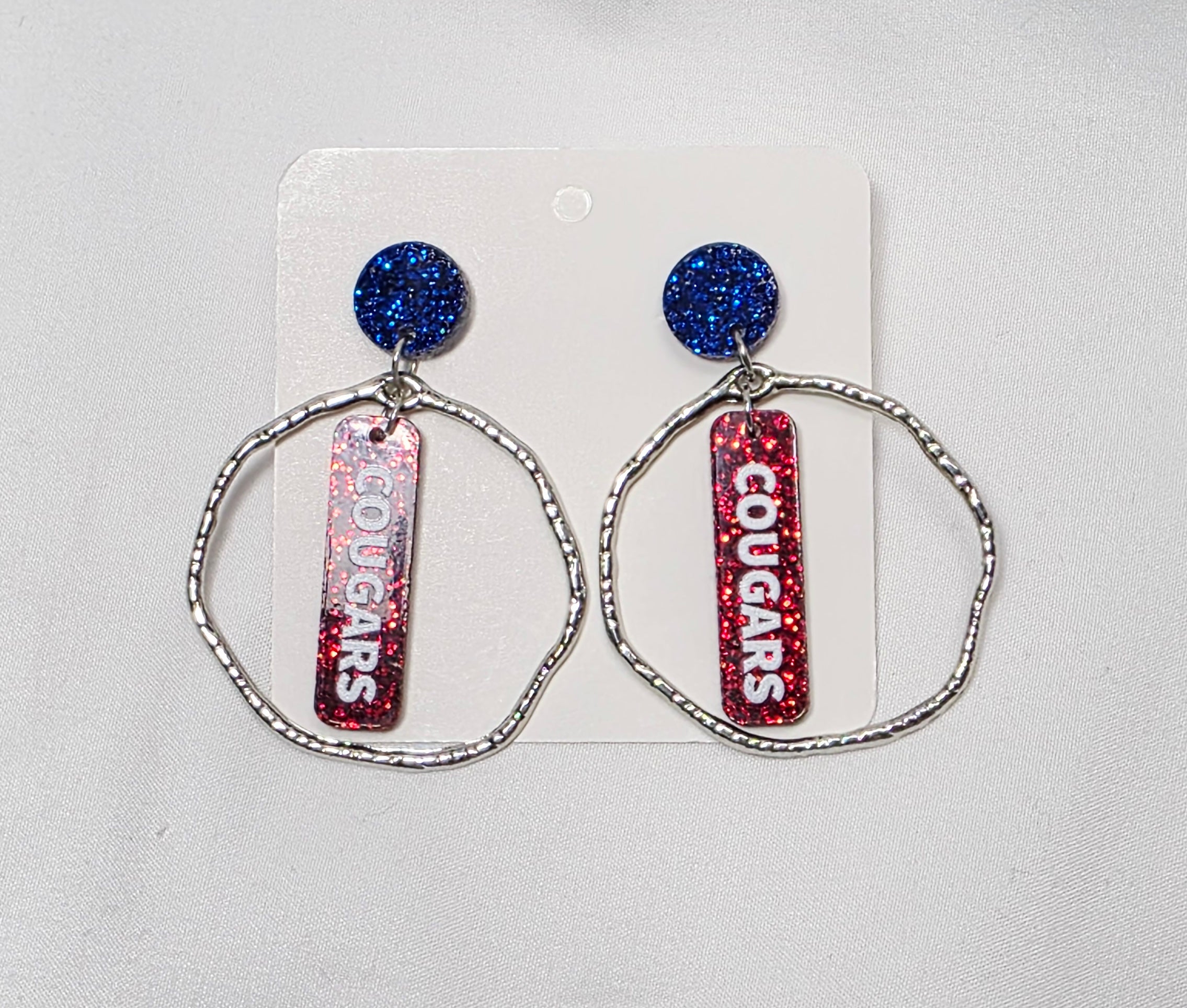 Custom Cougars Game Day earrings with glitter acrylic top and metal circle.