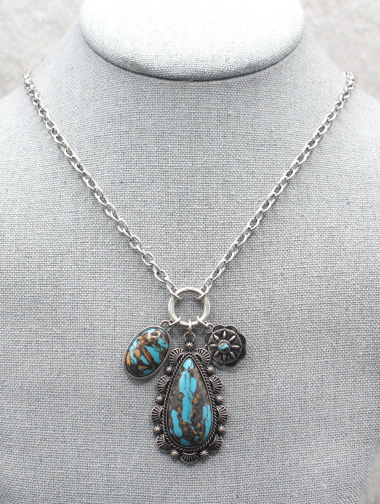 This statement necklace features three western-style charms suspended from a large central ring on a silver-tone chain. The focal point is a large teardrop-shaped faux turquoise pendant with a brown matrix, bezel-set in an oxidized, scalloped concho-style frame. It is flanked by a smaller oval turquoise charm and a decorative stamped medallion with a tiny turquoise bead at the center.