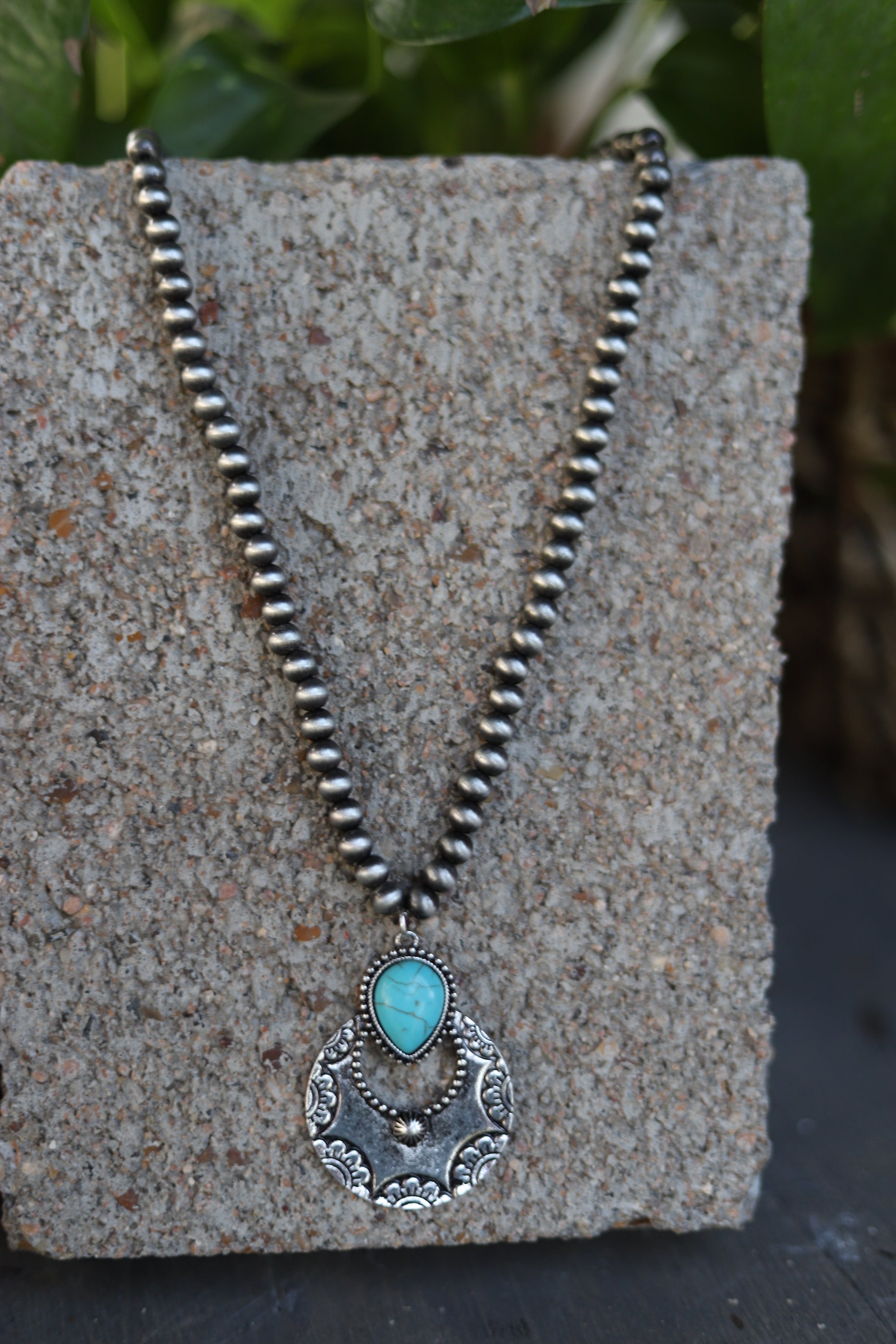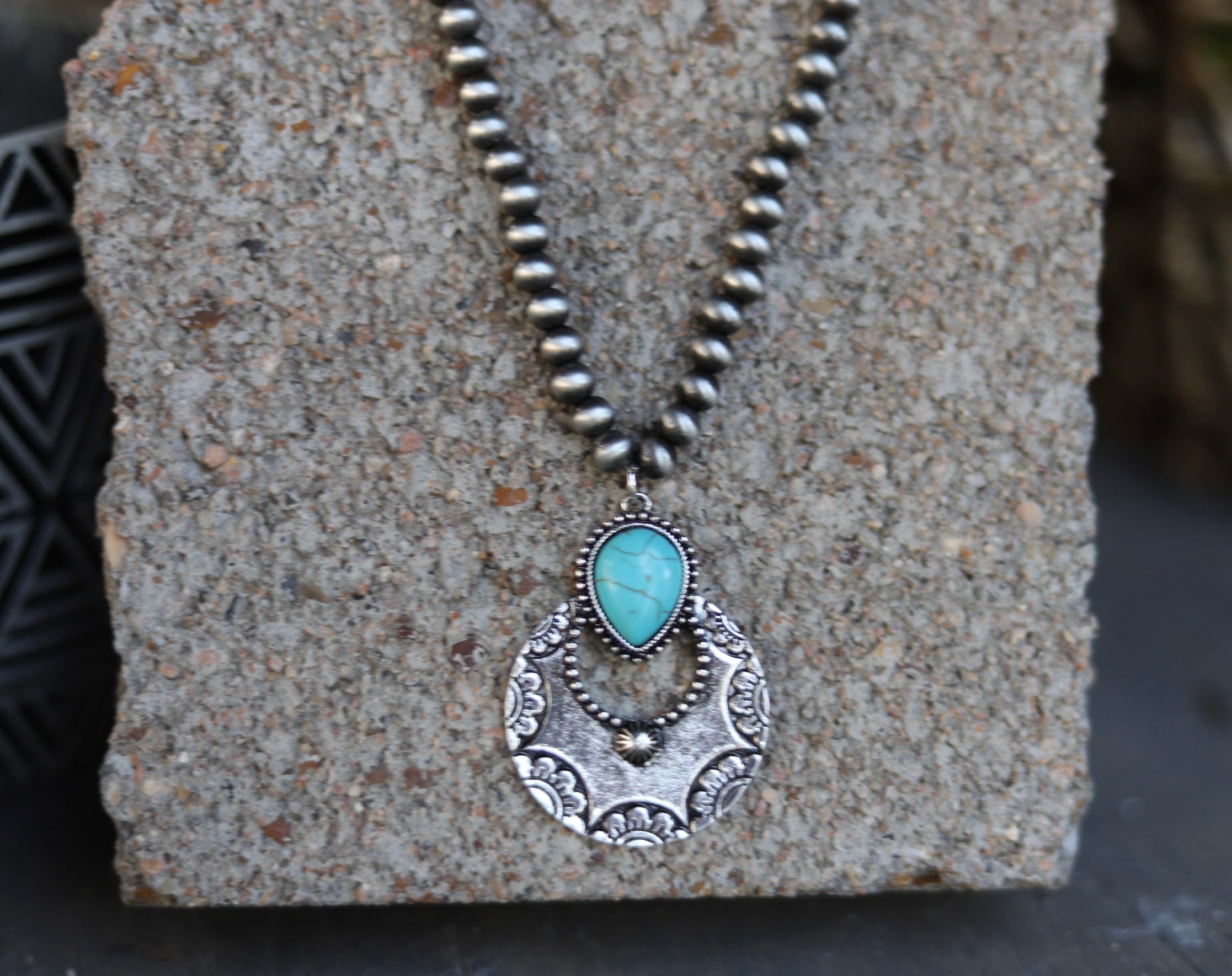 This necklace features a textured silver finish with a turquoise stone detail, providing a stylish, timeless look. On a 21' silver bead necklace. Fashion.