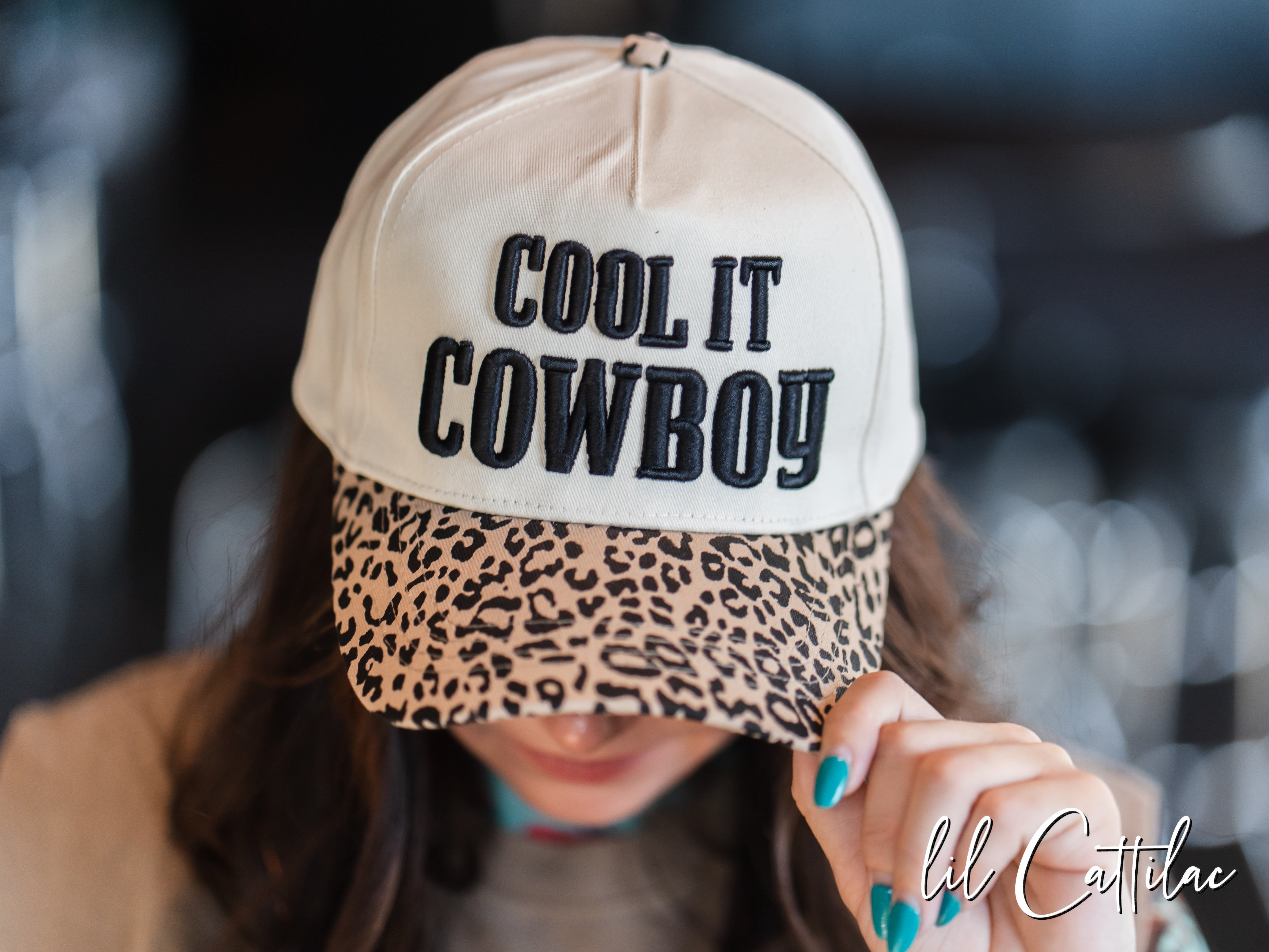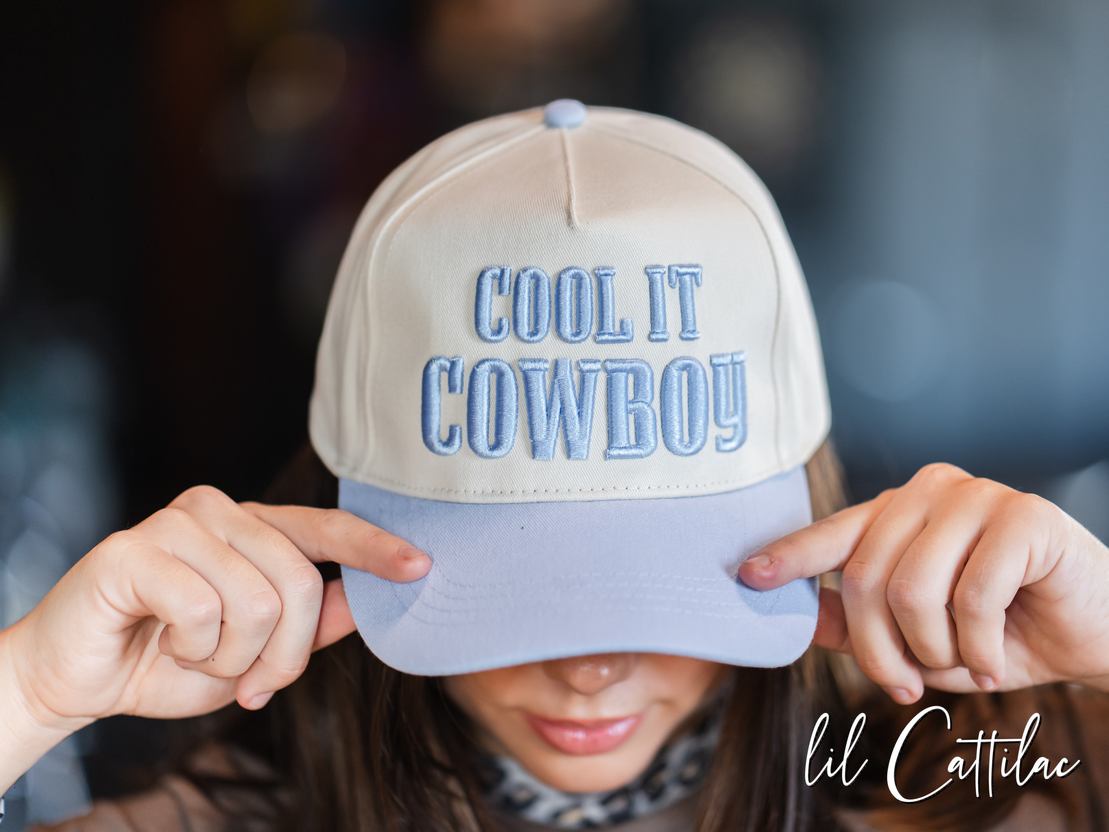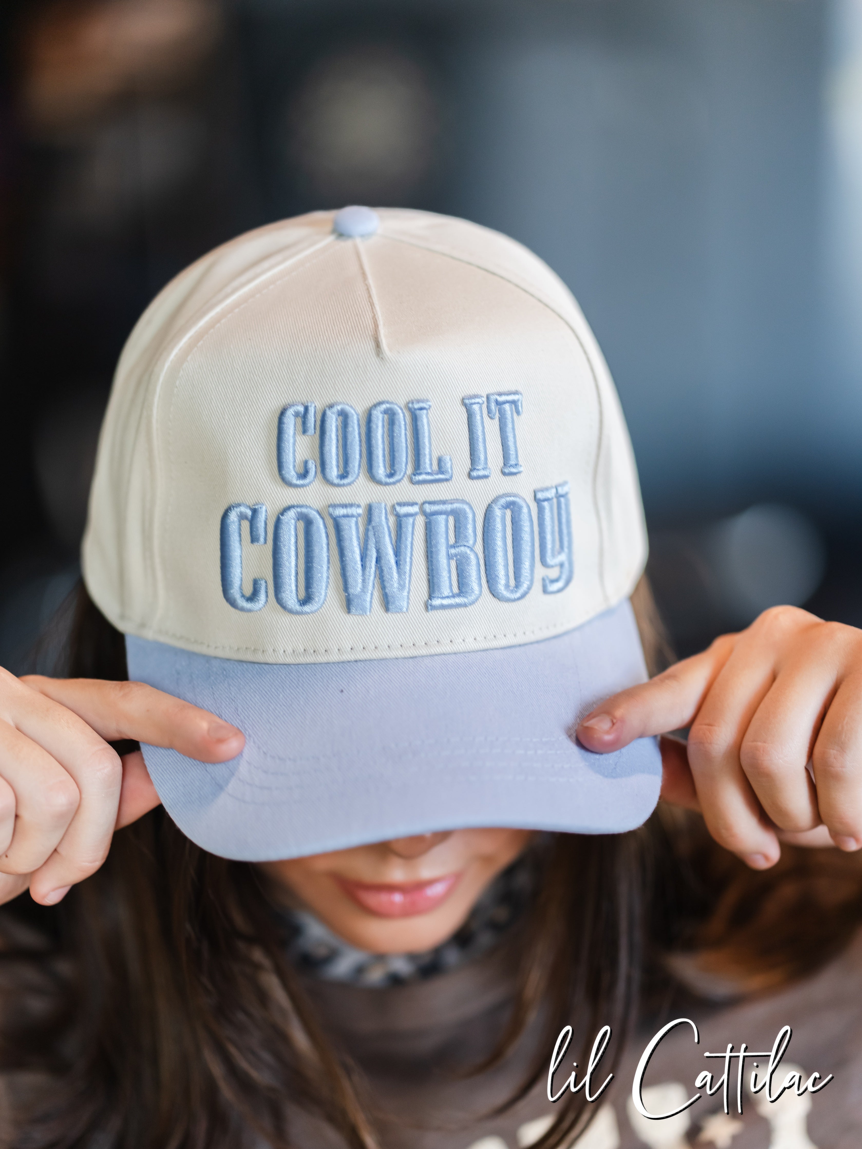 Accessorize any outfit with a Cool It Cowboy stitched with puff on a Trucker Cap! The 3D embroidery makes it so fun.