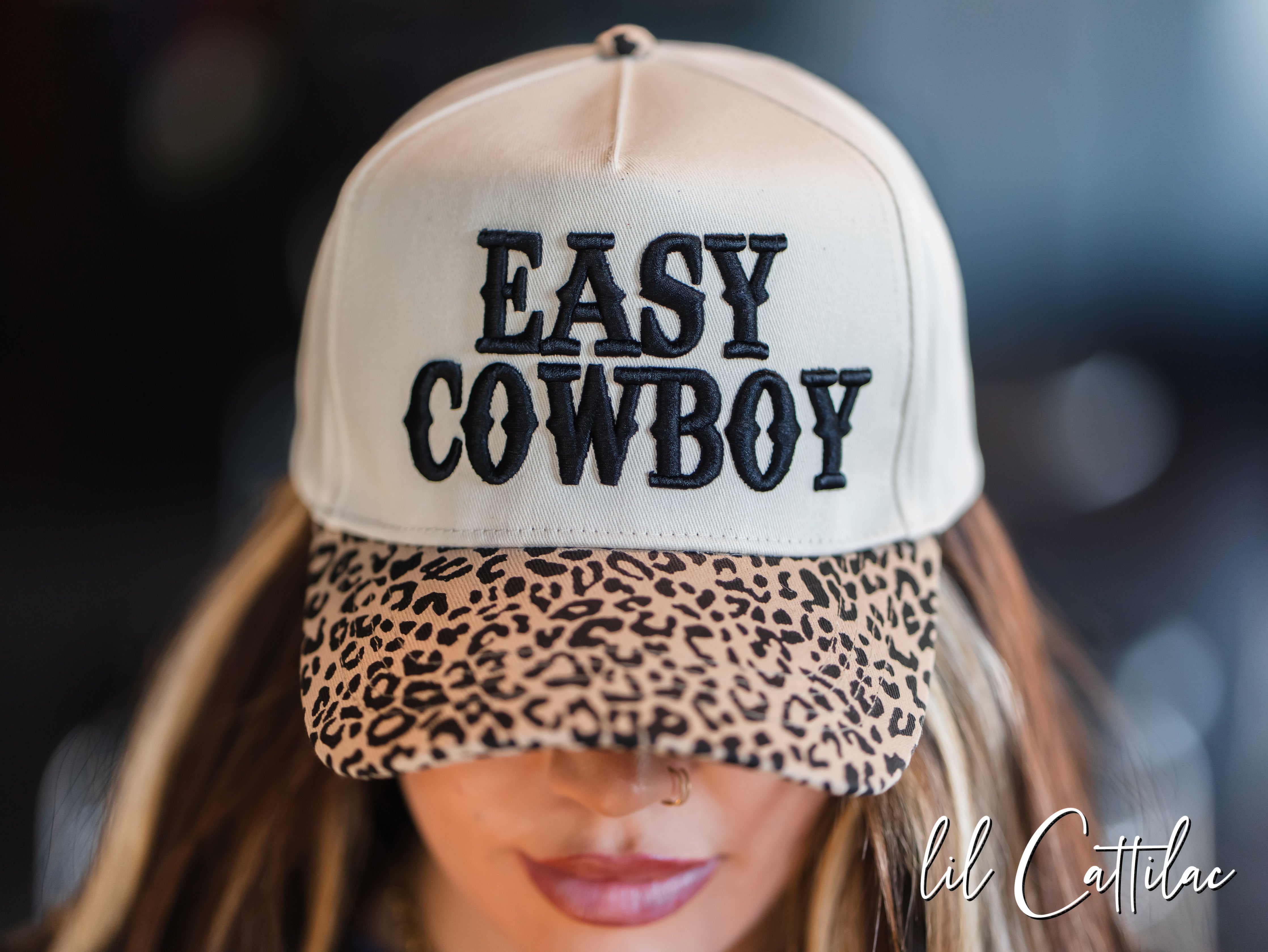 Accessorize any outfit with an Easy Cowboy stitched with puff on a Trucker Cap! The 3D embroidery makes it so fun.