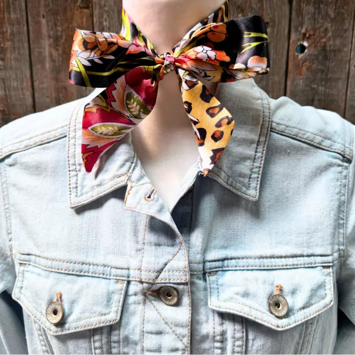 Western-Inspired Skinny Mini Scarf, brings a modern twist to the traditional wild rag. Why you'll love it: * Cheetah and floral design * Lightweight, 100% silky soft polyester * Can be used for as a purse wrap, headband, neckerchief and more! * Express your western style, dress up any outfit * Measuring 39" x 1.5" Purse and other accessories not included.