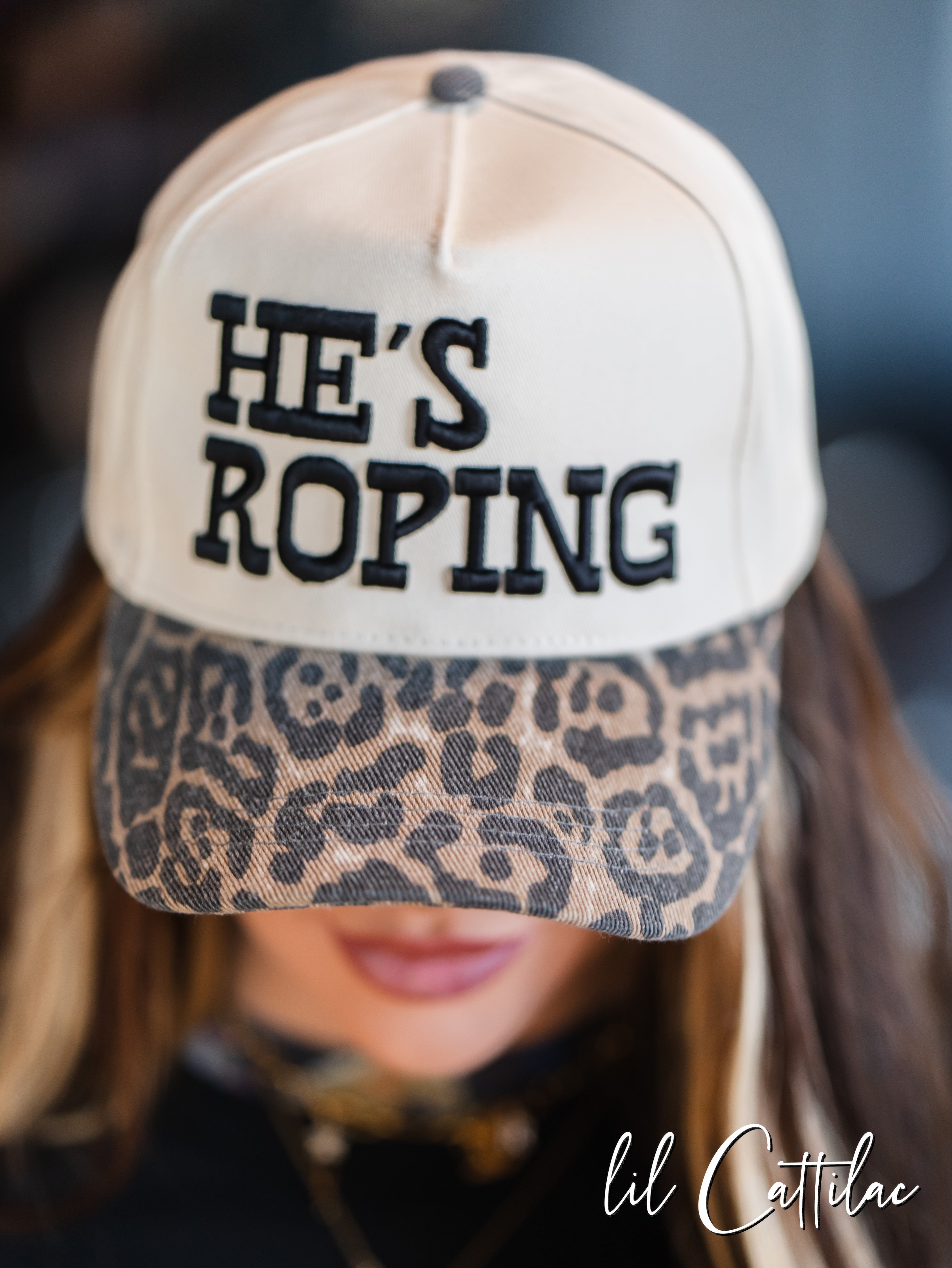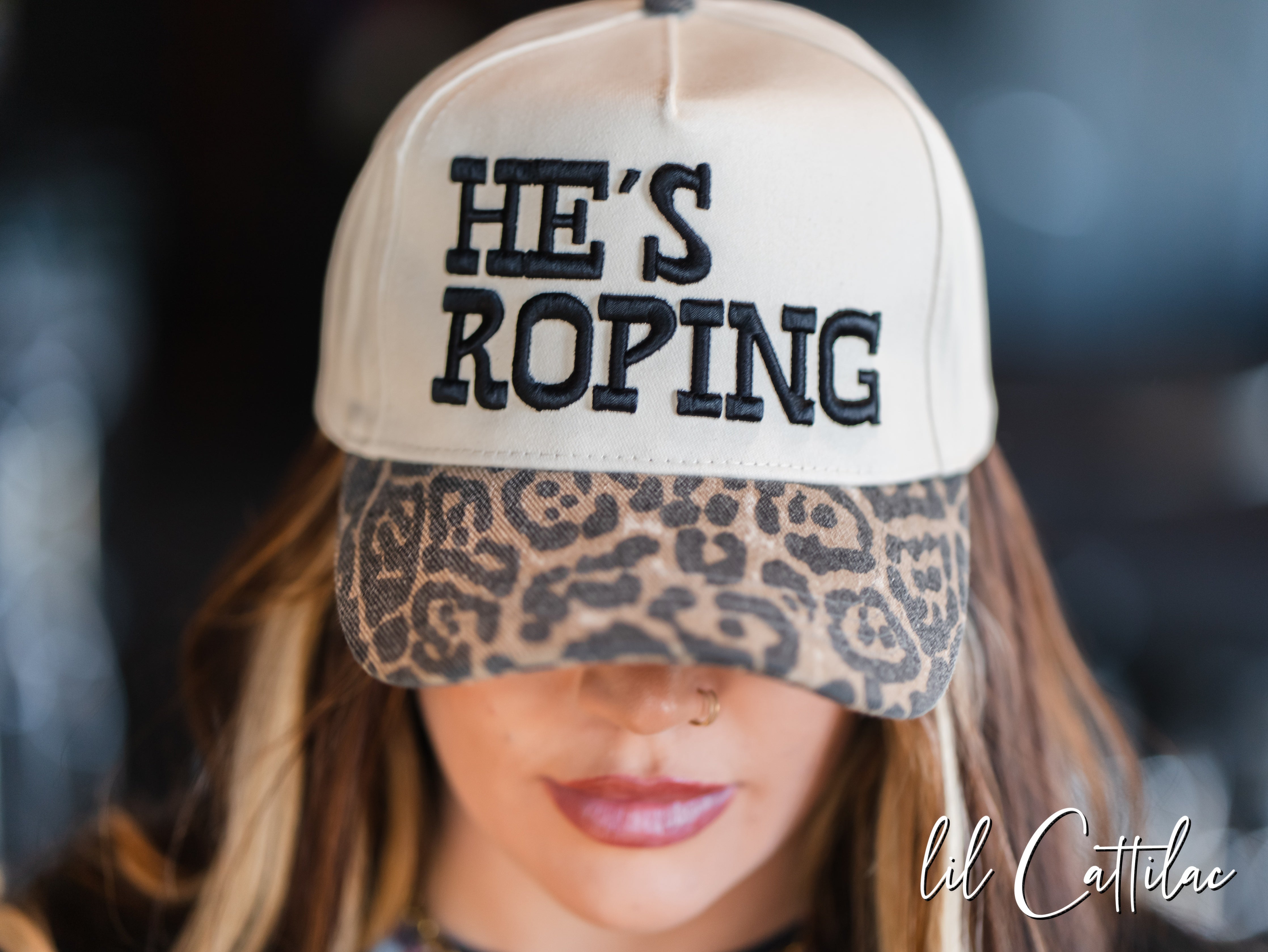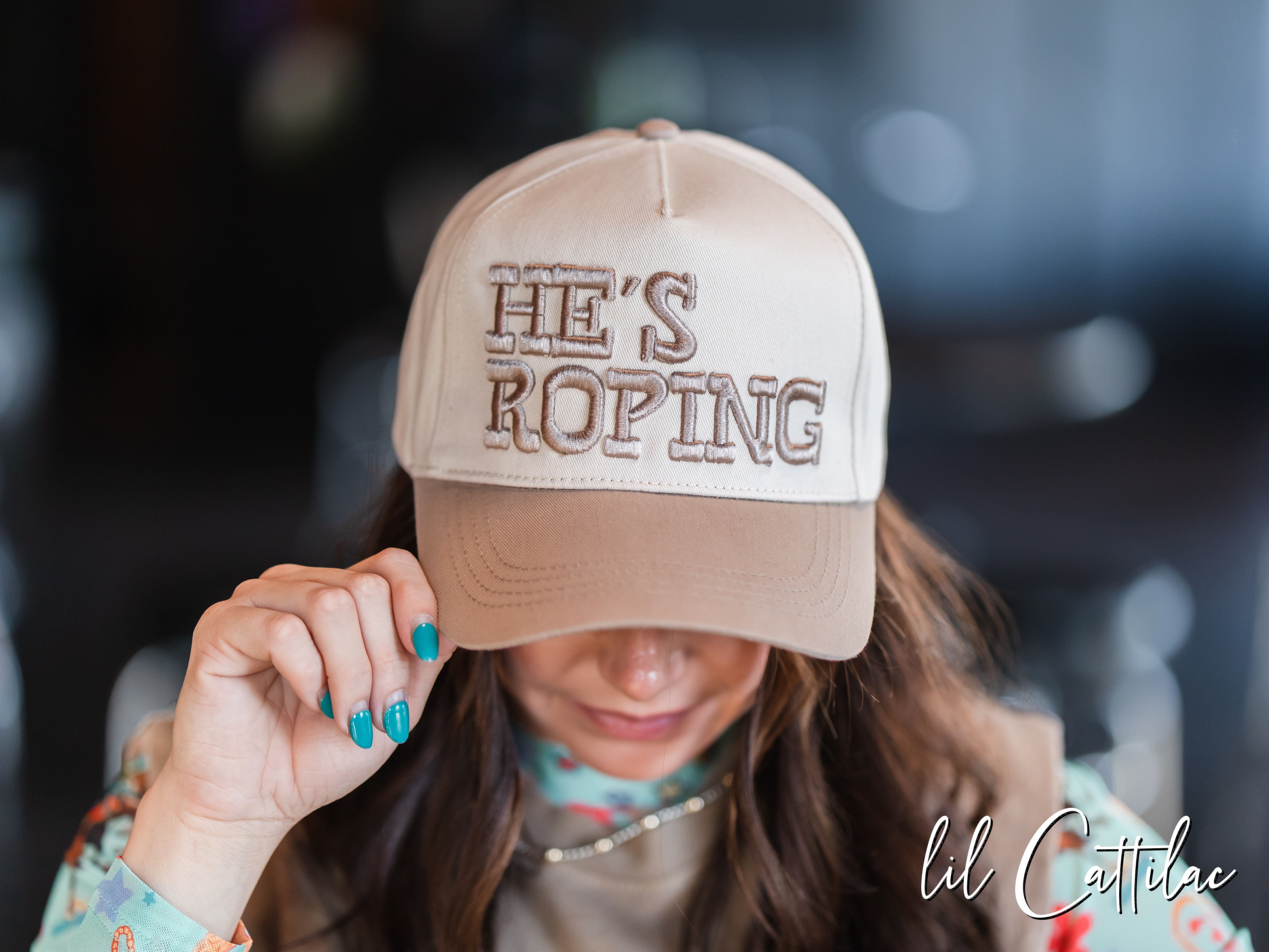 Accessorize any outfit with a He's Roping stitched with puff on a Trucker Cap! The 3D embroidery makes it so fun.