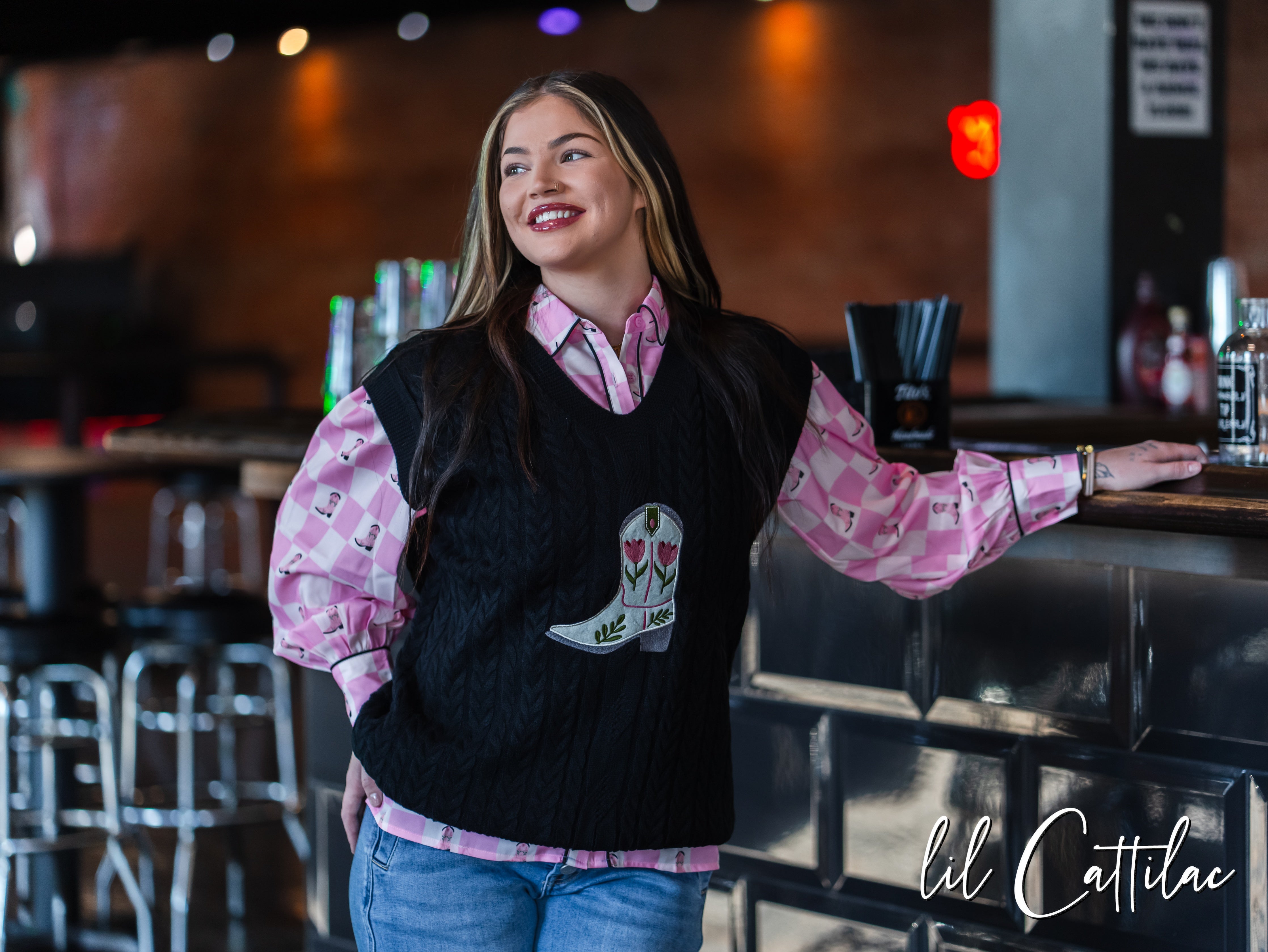 One boot, endless style. The Kodi Vest-black features a fun cable knit style sweater vest with a pink and green boot embroidered on fabric.