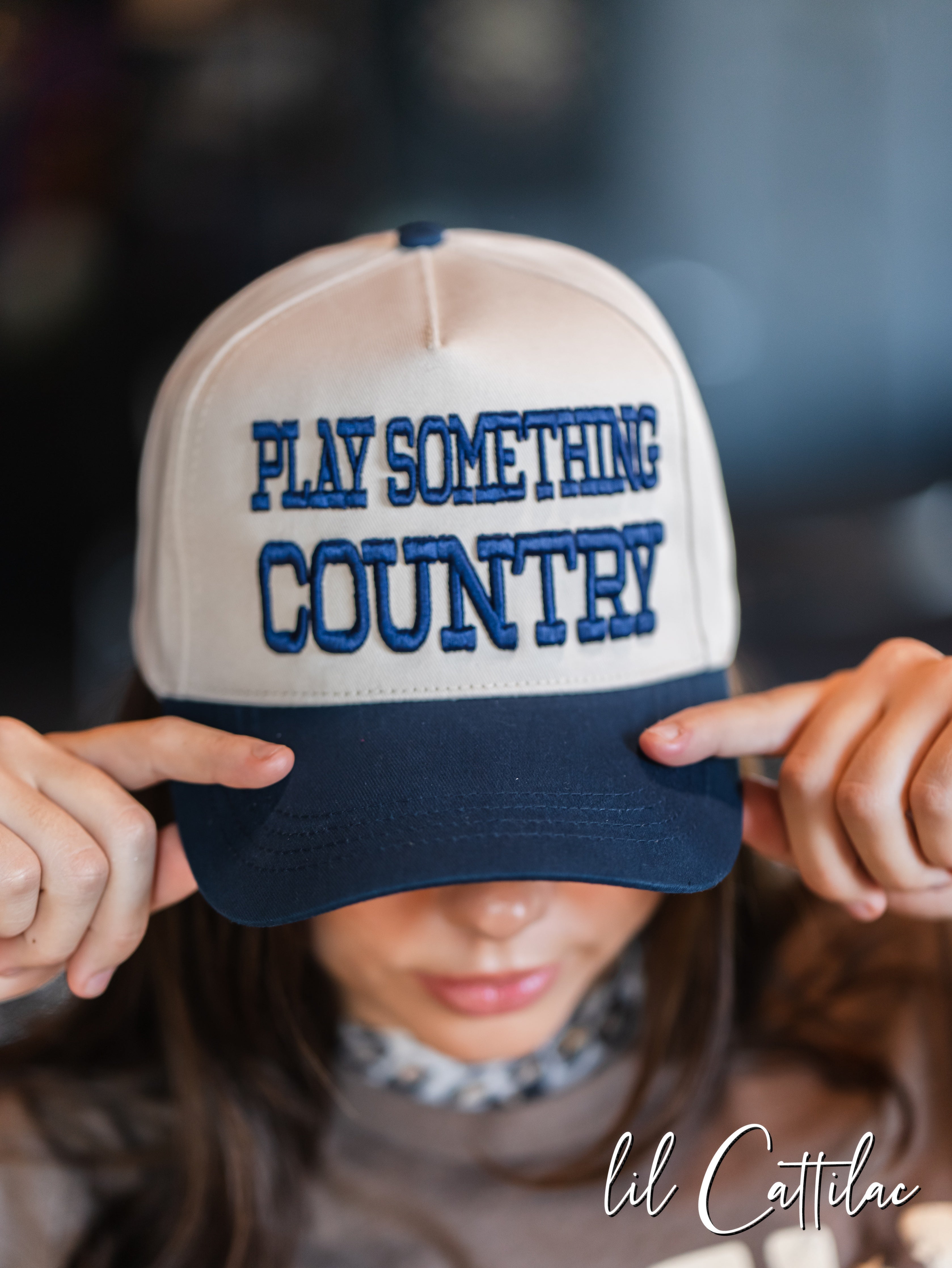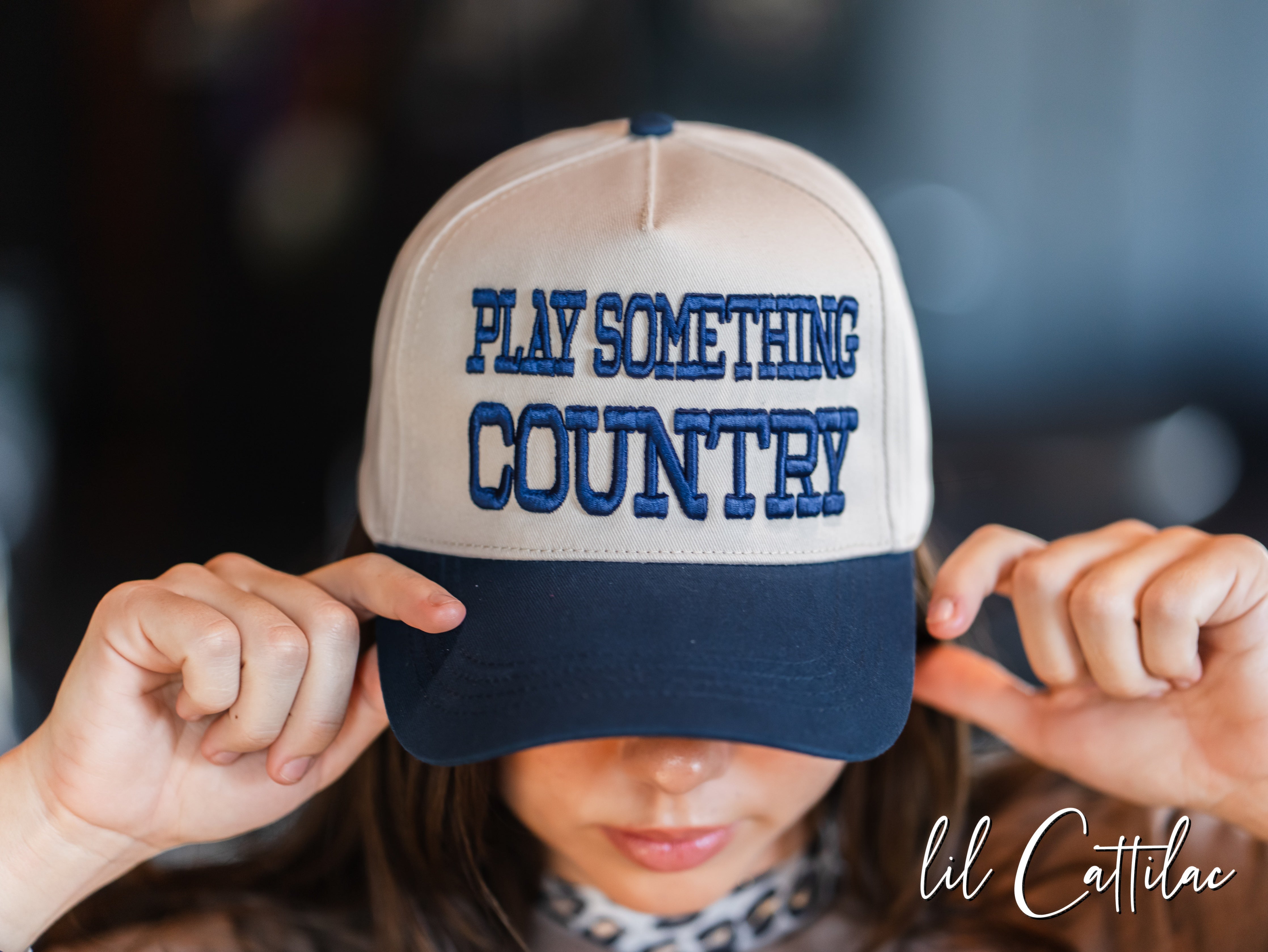 Accessorize any outfit with a Play Something Country stitched with puff on a Trucker Cap! The 3D embroidery makes it so fun.