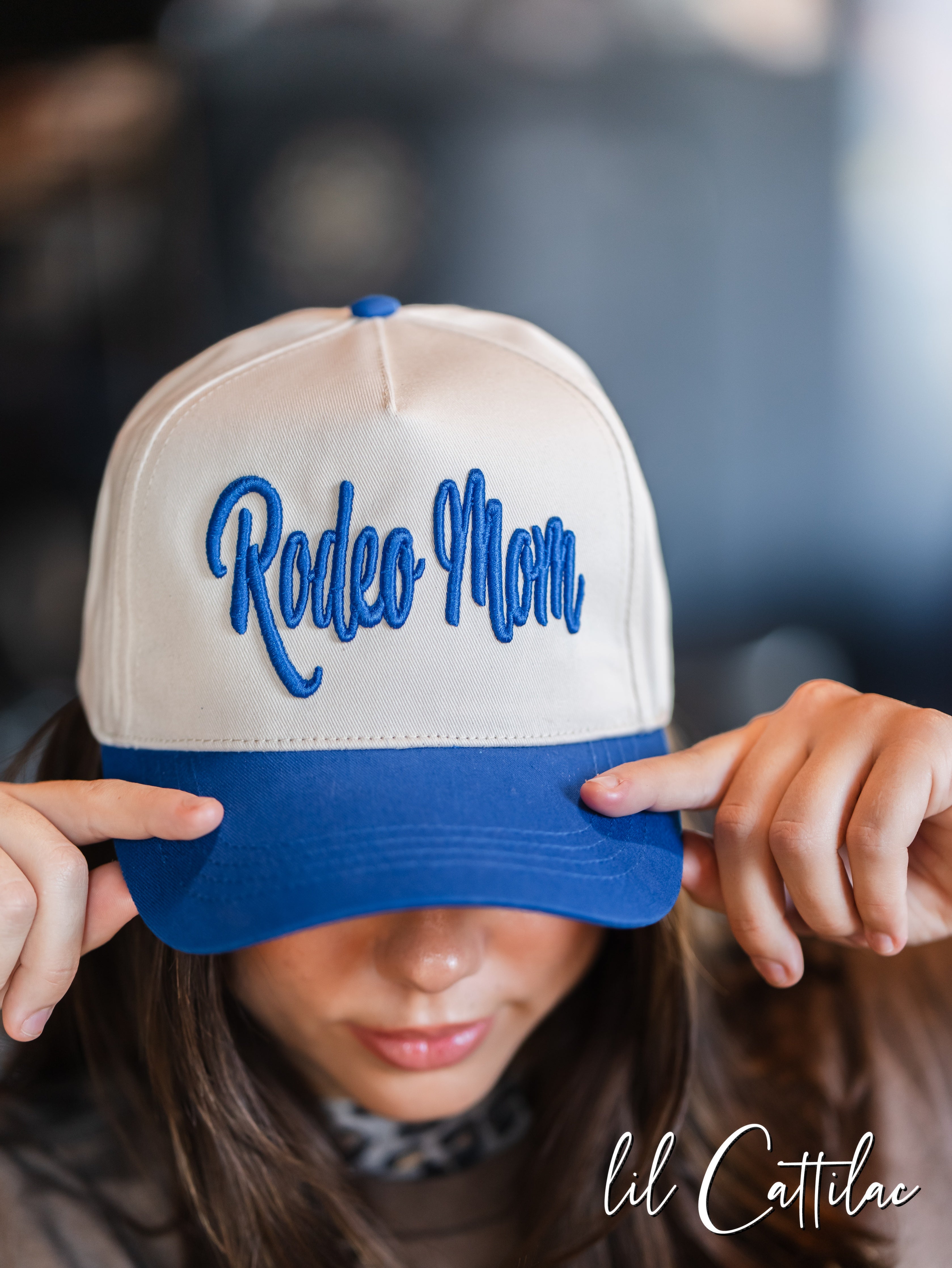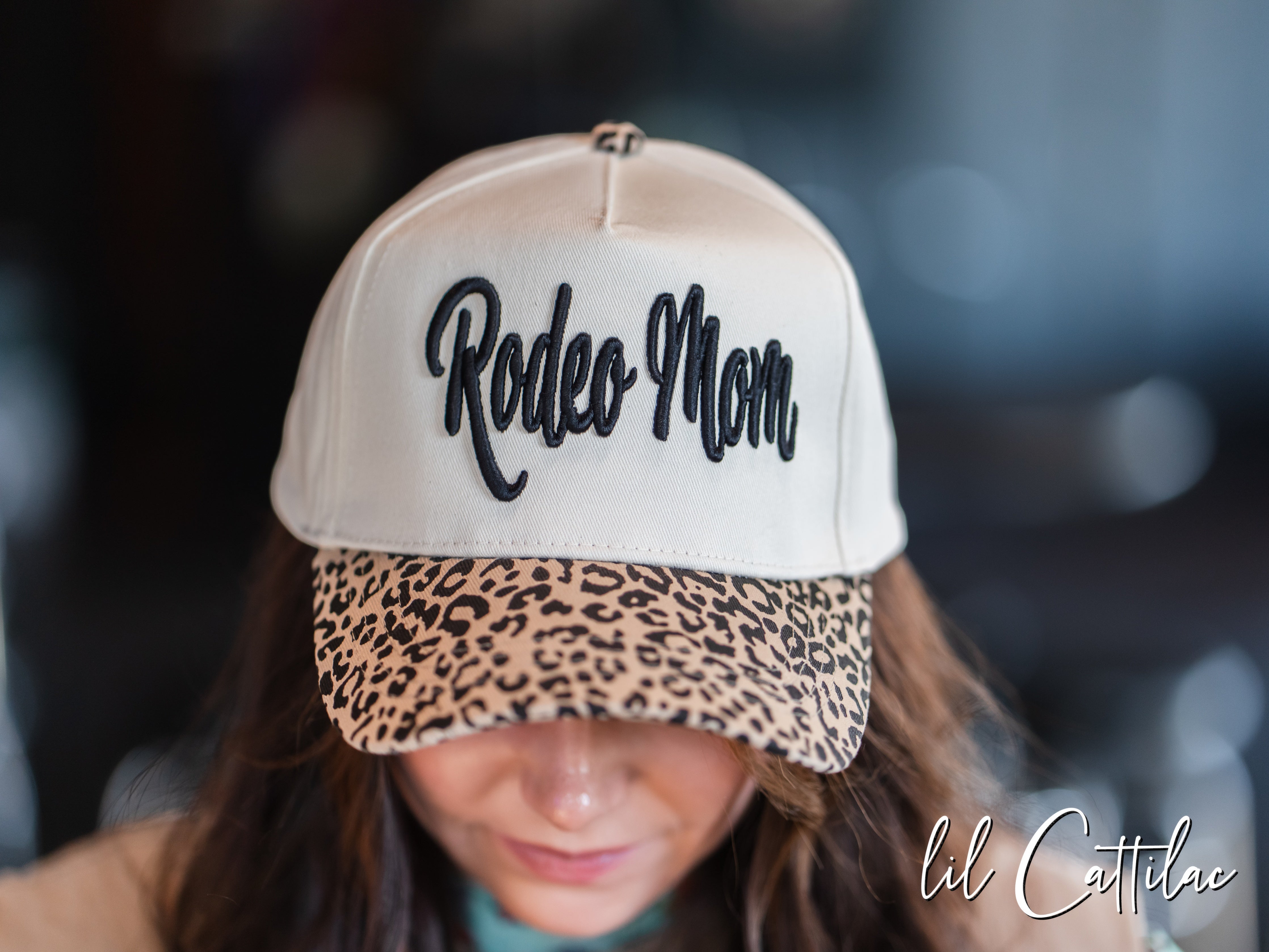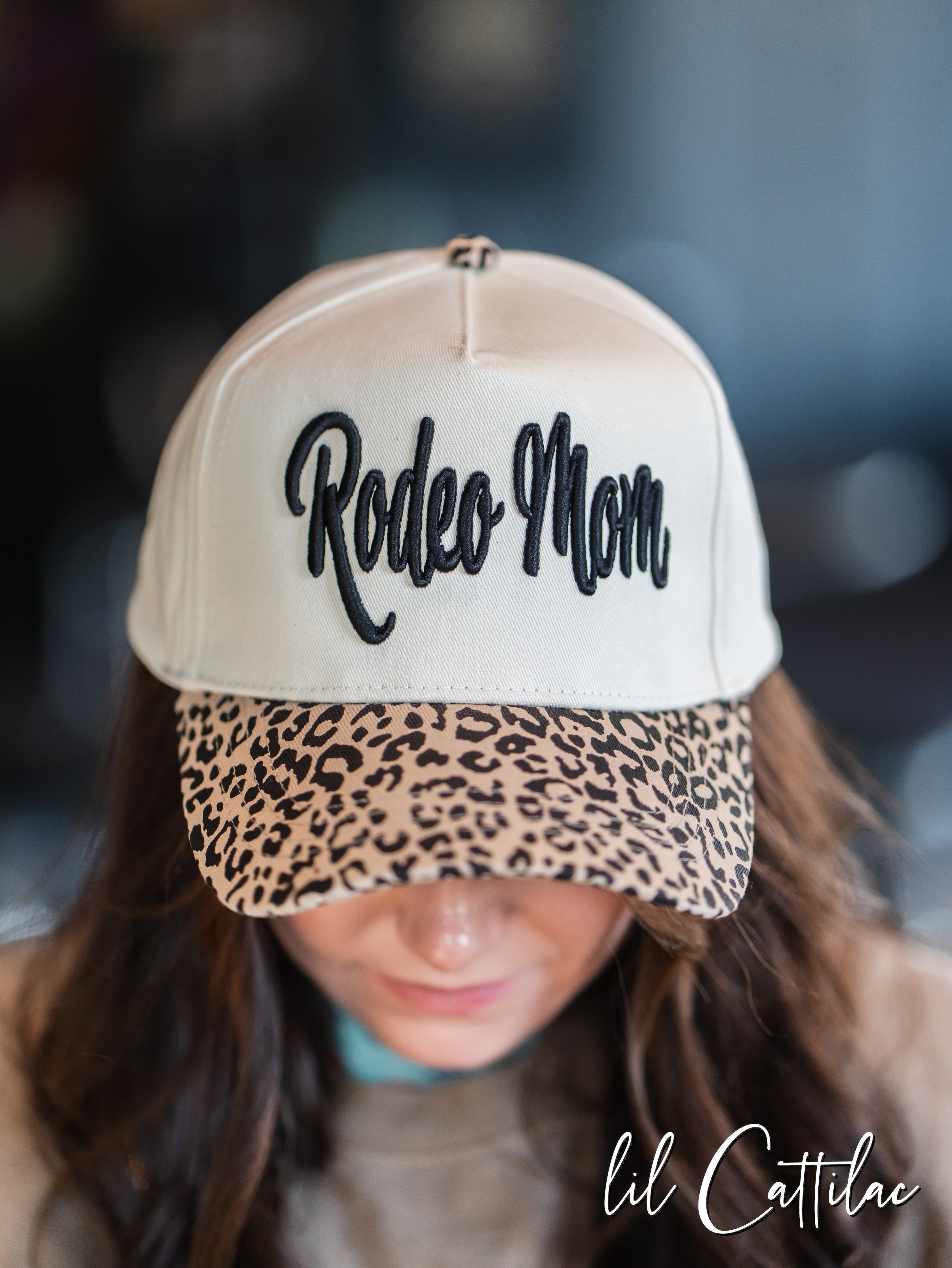 Accessorize any outfit with a Rodeo Mom stitched with puff on a Trucker Cap! The 3D embroidery makes it so fun.